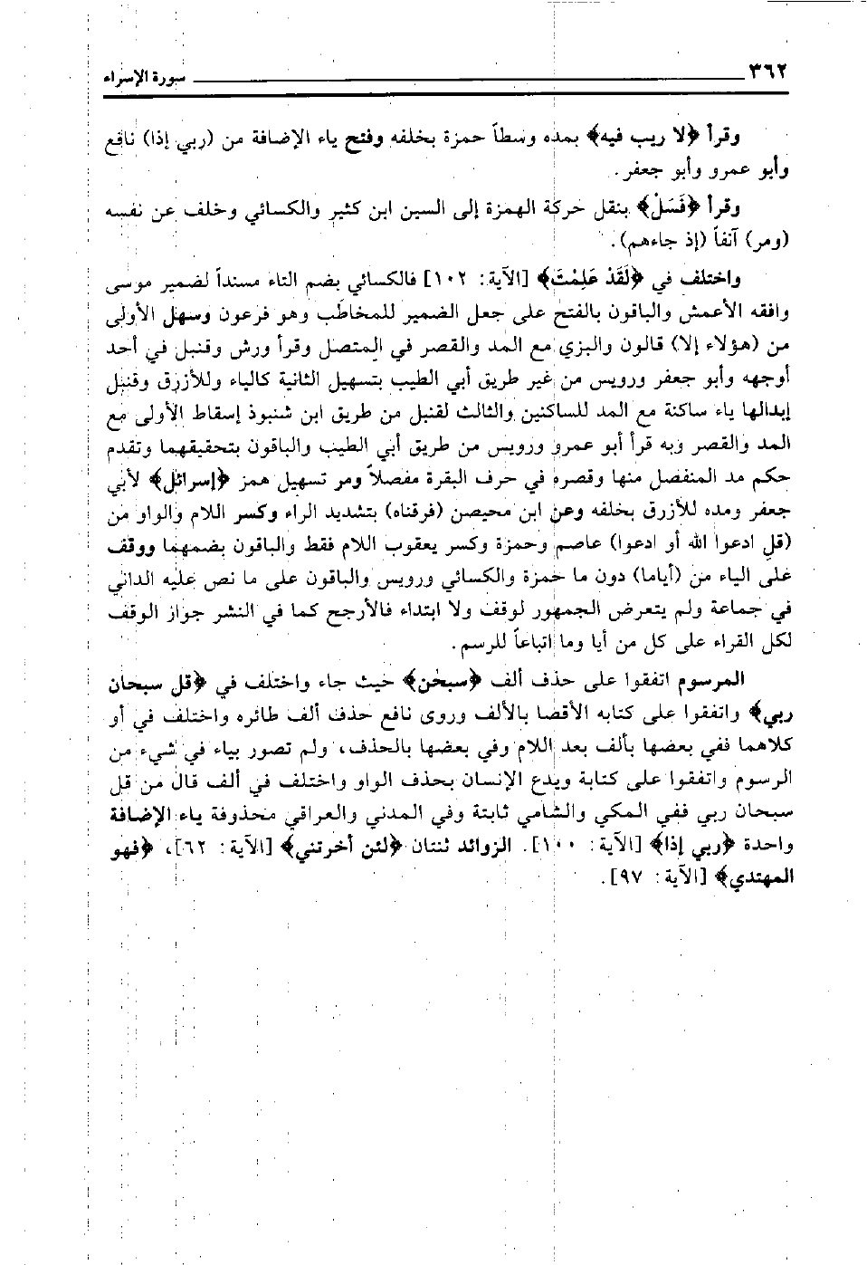 المرسوم اتفقوا على حذف ألف "سبحن" حيث جاء واختلف في "قُلْ سُبْحَانَ رَبِّي" واتفقوا على كتابة الأقصا بالألف, وروى نافع حذف ألف طائرة, واختلف في أو كلاهما ففي بعضها بألف بعد اللام, وفي بعضها بالحذف, ولم تصور بياء في شيء من الرسوم, واتفقوا على كتابة ويدع الإنسان بحذف الواو, واختلف في ألف قال من قل سبحان ربي, ففي المكي والشامي ثابتة وفي المدني والعراقي محذوفة ياء الإضافة واحدة "رَبِّي إِذًا" [الآية: 100] الزوائد ثنتان "لئن أخرتني" [الآية: 62] "فَهُوَ الْمُهْتَدِي" [الآية: 97] .