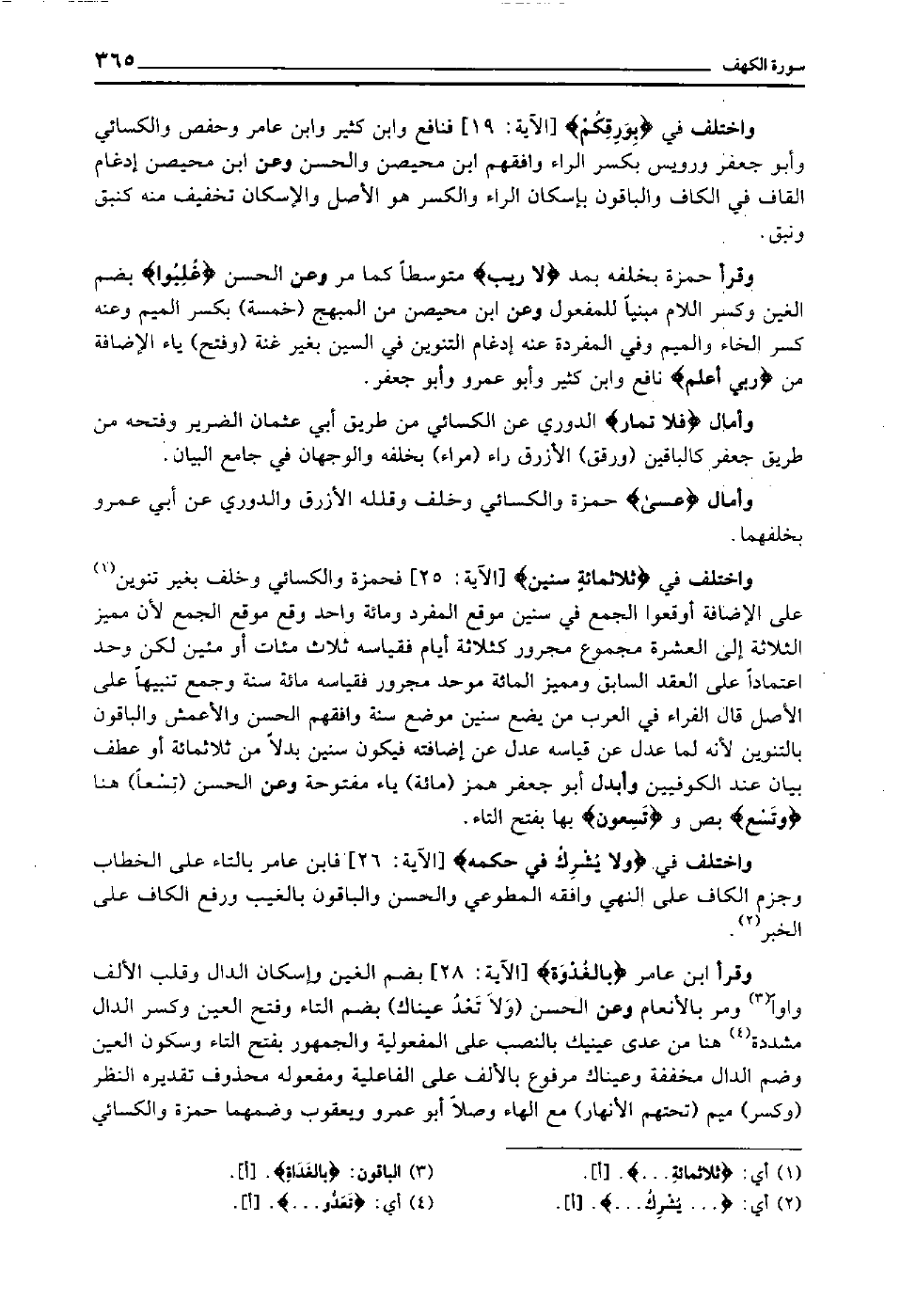 وقرأ ابن عامر "بالغدوة" [الآية: 28] بضم الغين وإسكان الدال وقلب الألف واوا3 ومر بالأنعام وعن الحسن "ولا تعد عيناك" بضم التاء وفتح العين وكسر الدال مشددة4 هنا من عدى عينيك بالنصب على المفعولية, والجمهور بفتح التاء وسكون العين وضم الدال مخففة, وعيناك مرفوع بالألف على الفاعلية, ومفعوله محذوف تقديره النظر "وكسر" ميم "تحتهم الأنهار" مع الهاء وصلا أبو عمرو ويعقوب وضمهما حمزة والكسائي