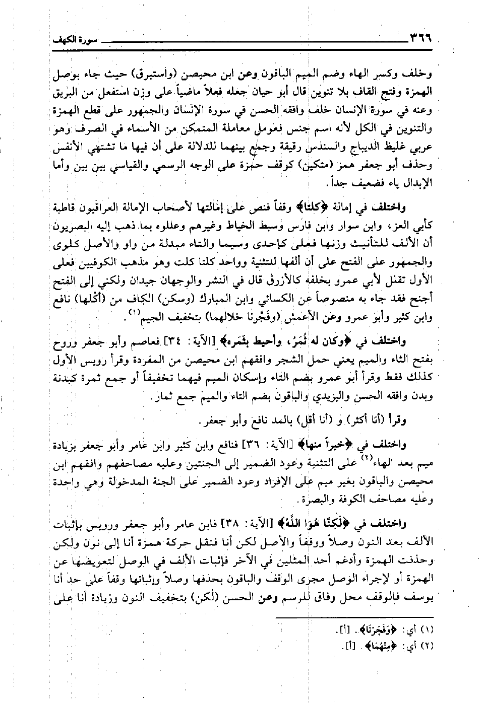 واختلف في "خَيْرًا مِنْهَا" [الآية: 36] فنافع وابن كثير وابن عامر وأبو جعفر بزيادة ميم بعد الهاء2 على التثنية وعود الضمير إلى الجنتين وعليه مصاحفهم, وافقهم ابن محيصن, والباقون بغير ميم على الإفراد وعود الضمير على الجنة المدخولة, وهي واحدة وعليه مصاحف الكوفة والبصرة.