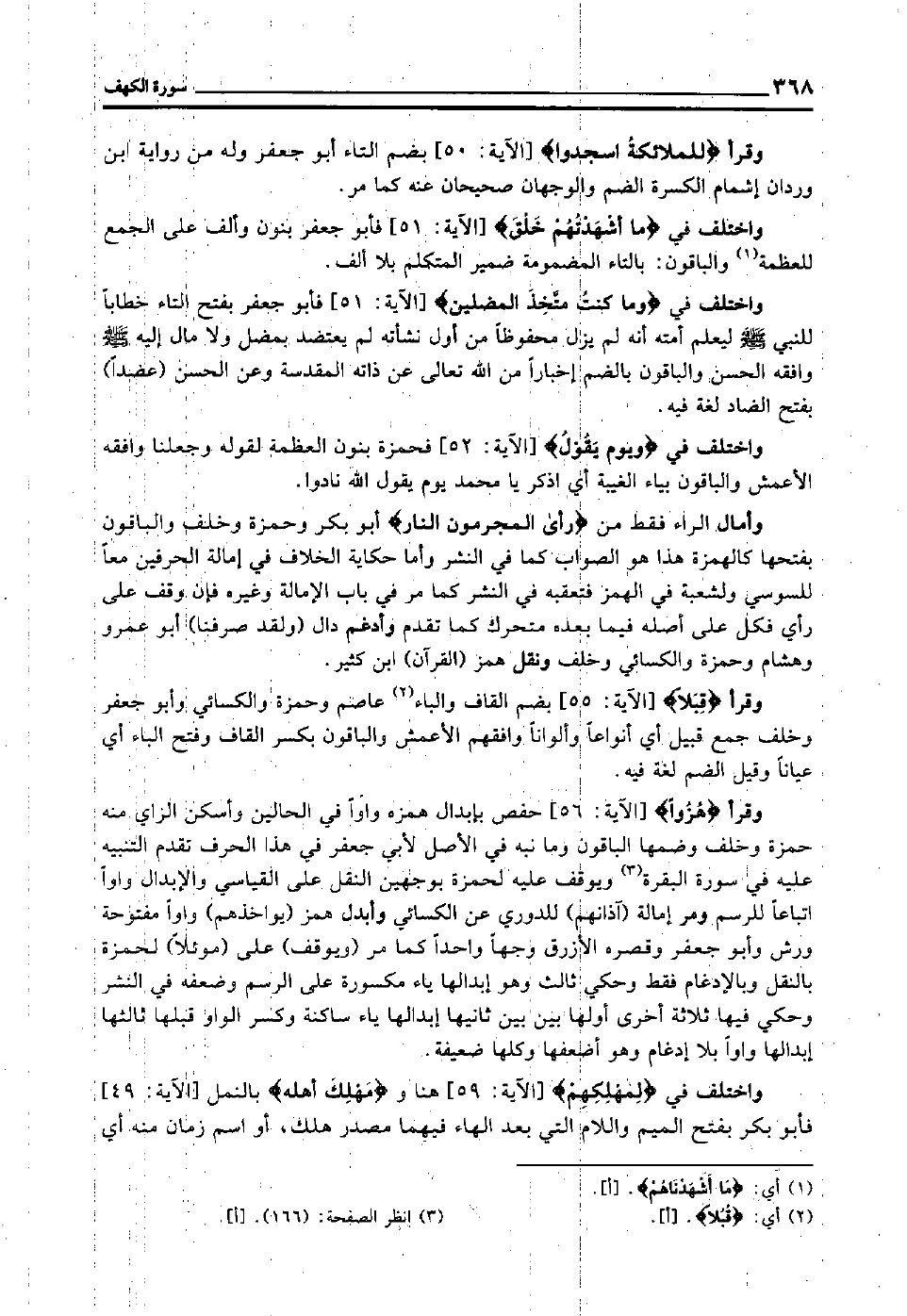 واختلف في "مَا أَشْهَدْتُهُمْ خَلْق" [الآية: 51] فأبو جعفر بنون وألف على الجمع للعظمة1, والباقون بالتاء المضمومة ضمير المتكلم بلا ألف.