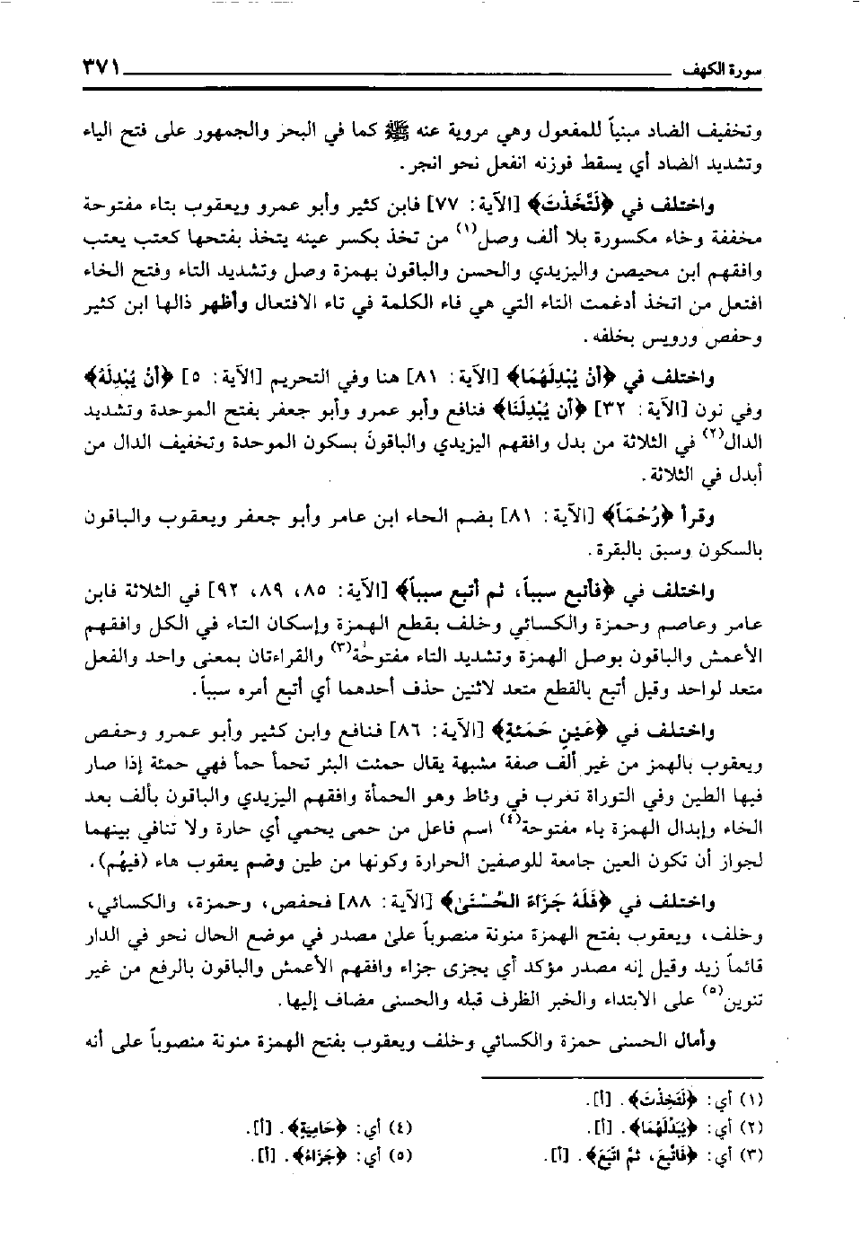 واختلف في "عَيْنٍ حَمِئَة" [الآية: 86] فنافع وابن كثير وأبو عمرو وحفص ويعقوب بالهمز من غير ألف صفة مشبهة, يقال حمئت البئر تحمأ حمأ فهي حمئة إذا صار فيها الطين, وفي التوراة تغرب في وئاط وهو الحمأة, وافقهم اليزيدي, والباقون بألف بعد الخاء وإبدال الهمزة ياء مفتوحة4 اسم فاعل من حمى يحمي أي: حارة ولا تنافي بينهما, لجواز أن تكون العين جامعة للوصفين الحرارة, وكونها من طين وضم يعقوب هاء "فيهم".واختلف في "فَلَهُ جَزَاءً الْحُسْنَى" [الآية: 88] فحفص وحمزة والكسائي وخلف ويعقوب بفتح الهمزة منونة منصوبا على مصدر في موضع الحال نحو: في الدار قائما زيد وقيل: إنه مصدر مؤكد أي: يجزى جزاء, وافقهم الأعمش والباقون بالرفع من غير تنوين5 على الابتداء, والخبر الظرف قبله والحسنى مضاف إليها.