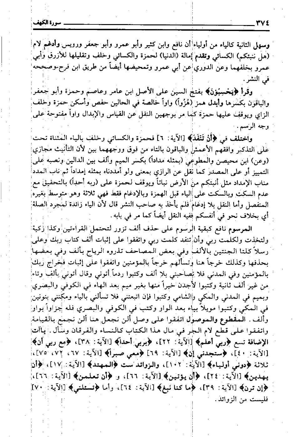 المرسوم نافع كبقية الرسوم على حذف ألف تزور لتحتمل القراءتين, وكذا زكية ولتخذت, ولكلمت ربي, وأن تنفد كلمت ربي, واتفقوا على إثبات ألف كتاب ربك وعلى رسلا كلتا الجنتين بالألف, وفي بعض المصاحف تذروه الرياح بألف, وفي بعضها بحذفها, وكذلك خرجا هنا وتسألهم خرجا بالمؤمنين, واتفقوا على إثبات فخراج ربك بالمؤمنين, وفي المدني فلا تصاحبني بلا ألف, وكتبوا ردما أتوني, وقال: أتوني بألف وتاء من غير ألف ثانية, وكتبوا لأجدن خيرا منها بغير ميم بعد الهاء في الكوفي والبصري وبميم في المدني والمكي والشامي, وكتبوا فإن اتبعتني فلا تسألني بالياء, ومكنني بنونين في المكي, وكتبوا مويلا بياء بعد الواو, وكتب في الكوفي والبصري فله جزاوا بواو وألف. المقطوع والموصول اتفقوا على وصل ألن نجعل هنا ألن نجمع بالقيامة, واتفقوا على قطع لام الجر في مال هذا الكتاب كالنساء والفرقان وسأل. ياءات الإضافة تسع "رَبِّي أَعْلَم" [الآية: 22] "بِرَبِّي أَحَدًا" [الآية: 38] مع "رَبِّي إِن" [الآية: 40] "سَتَجِدُنِي إِن" [الآية: 69] "مَعِيَ صَبْرًا" [الآية: 67، 72، 75] ثلاثة "دُونِي أَوْلِيَاء" [الآية: 102] والزوائد ست "المهتد" [الآية: 17] "أَنْ يَهْدِيَن" [الآية: 24] "أَنْ يُؤْتِيَن" [الآية: 66] و"أَنْ تُعَلِّمَن" [الآية: 66] "إِنْ تَرَن" [الآية: 39] "مَا كُنَّا نَبْغ" [الآية: 64] وأما "تسئلني" [الآية: 70] فليست من الزوائد.