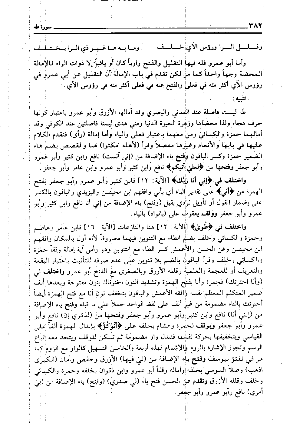 طه ليست فاصلة عند المدني والبصري, وقد أمالها الأزرق وأبو عمرو باعتبار كونها حرف هجاء, ولذا محضاها وزهرة الحيوة الدنيا ومني هدى ليستا فاصلتين عند الكوفي, وقد أمالهما حمزة والكسائي ومن معهما باعتبار فعلى والياء وأما إمالة "رأى" فتقدم الكلام عليها في بابها والأنعام وغيرها مفصلا, وقرأ "لأهله امكثوا" هنا والقصص بضم هاء الضمير حمزة وكسر الباقون وفتح ياء الإضافة من "إني آنست" نافع وابن كثير وأبو عمرو وأبو جعفر, وفتحها من "لَعَلِّي آتِيكُم" نافع وابن كثير وأبو عمرو وابن عامر وأبو جعفر.