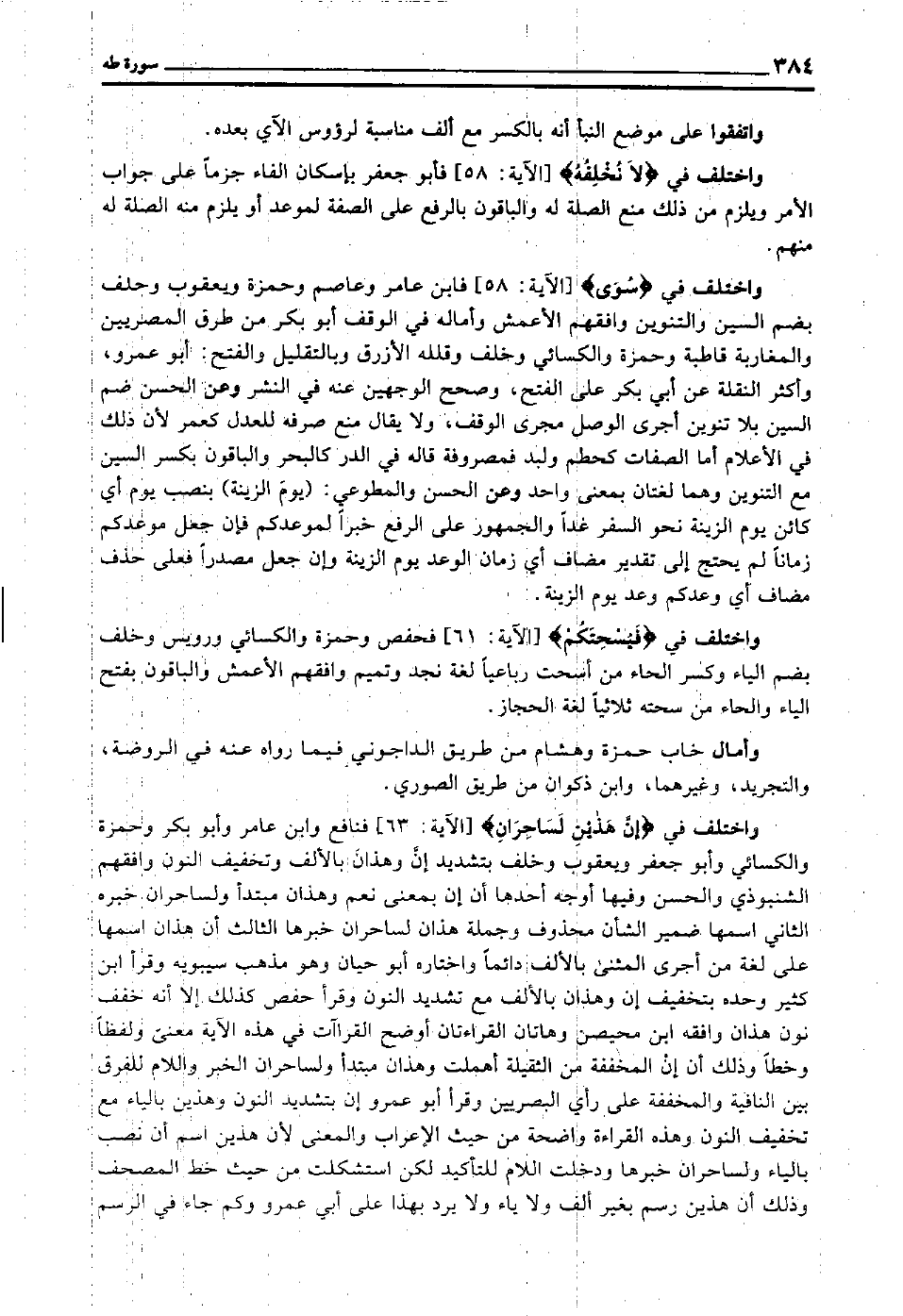 واختلف في "إن هذين لساحران" [الآية: 63] فنافع وابن عامر وأبو بكر وحمزة والكسائي وأبو جعفر ويعقوب وخلف بتشديد إن وهذان بالألف, وتخفيف النون وافقهم الشنبوذي والحسن, وفيها أوجه: أحدها أن إن بمعنى نعم, وهذان مبتدأ ولساحران خبره, الثاني اسمها ضمير الشأن محذوف, وجملة هذان لساحران خبرها, الثالث أن هذان اسمها على لغة من أجرى المثنى بالألف دائما, واختاره أبو حيان, وهو مذهب سيبويه, وقرأ ابن كثير وحده بتخفيف إن وهذان بالألف مع تشديد النون, وقرأ حفص كذلك إلا أنه خفف نون هذان, وافقه ابن محيصن وهاتان القراءتان أوضح القراءات في هذه الآية: معنى ولفظا وخطا, وذلك أن إن المخففة من الثقيلة أهملت وهذان مبتدأ ولساحران الخبر واللام للفرق بين النافية والمخففة على رأي البصريين, وقرأ أبو عمرو إن بتشديد النون وهذين بالياء مع تخفيف النون, وهذه القراءة واضحة من حيث الإعراب والمعنى؛ لأن هذين اسم أن نصب بالياء, ولساحران خبرها ودخلت اللام للتأكيد, لكن استشكلت من حيث خط المصحف, وذلك أن هذين رسم بغير ألف ولا ياء ولا يرد بهذا على أبي عمرو, وكم جاء في الرسم