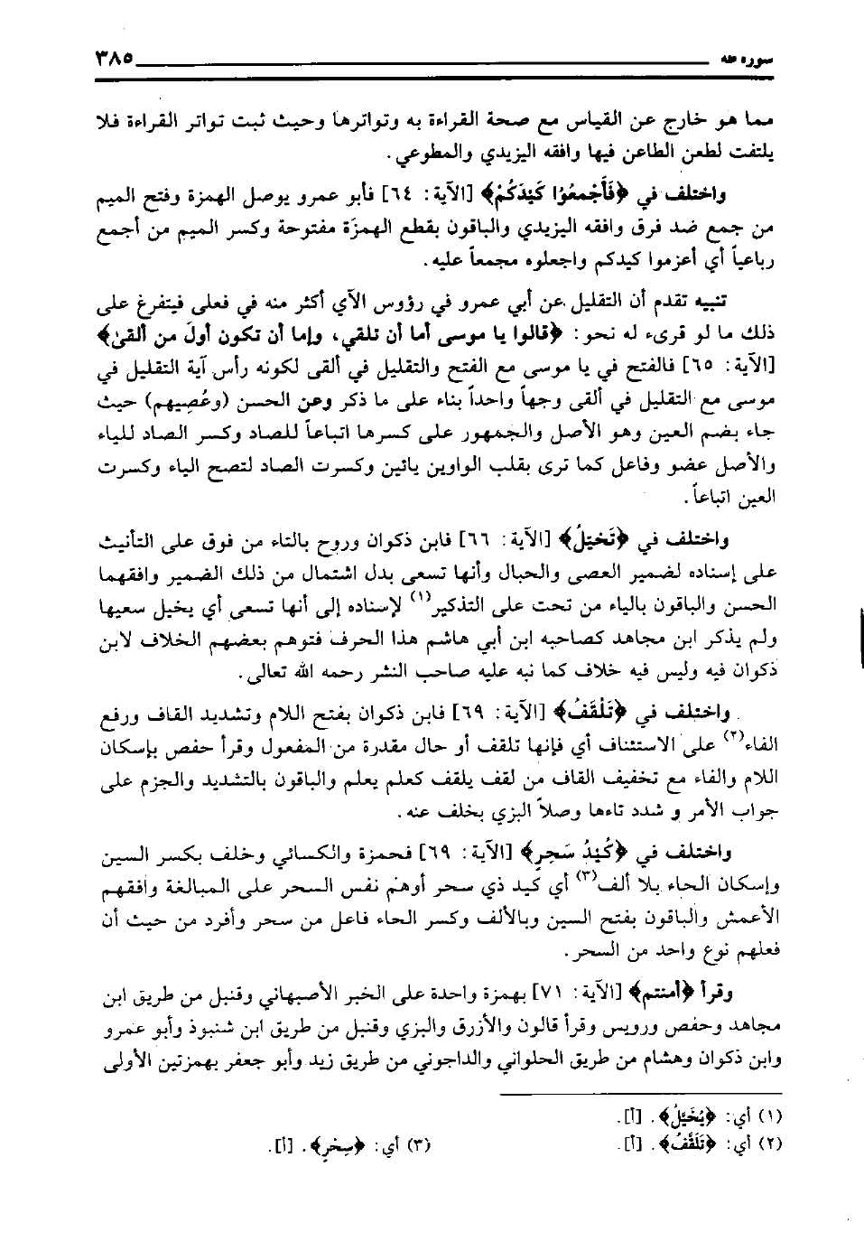 واختلف في "كَيْدُ سَحِر" [الآية: 69] فحمزة والكسائي وخلف بكسر السين وإسكان الحاء بلا ألف3 أي: كيد ذي سحر أوهم نفس السحر على المبالغة, وافقهم الأعمش, والباقون بفتح السين وبالألف وكسر الحاء فاعل من سحر, وأفرد من حيث إن فعلهم نوع واحد من السحر.