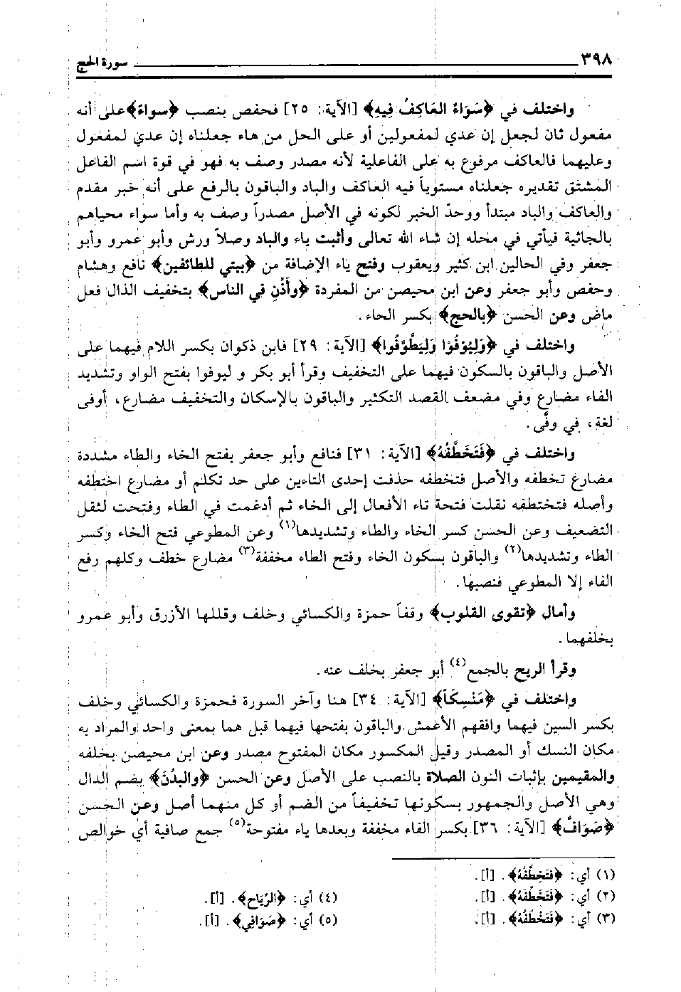 واختلف في "سَوَاءً الْعَاكِفُ فِيه" [الآية: 25] فحفص بنصب "سواء" على أنه مفعول ثان لجعل إن عدي لمفعولين, أو على الحل من هاء جعلناه إن عدي لمفعول وعليهما فالعاكف مرفوع به على الفاعلية؛ لأنه مصدر وصف به فهو في قوة اسم الفاعل المشتق تقديره جعلناه مستويا فيه العاكف والباد, والباقون بالرفع على أنه خبر مقدم, والعاكف والباد مبتدأ ووحد الخبر لكونه في الأصل مصدرا وصف به, وأما سواء محياهم بالجاثية فيأتي في محله إن شاء الله تعالى, وأثبت ياء والباد وصلا ورش وأبو عمرو وأبو جعفر وفي الحالين ابن كثير ويعقوب وفتح ياء الإضافة من "بَيْتِيَ لِلطَّائِفِين" نافع وهشام وحفص وأبو جعفر وعن ابن محيصن من المفردة "وَأَذِّنْ فِي النَّاس" بتخفيف