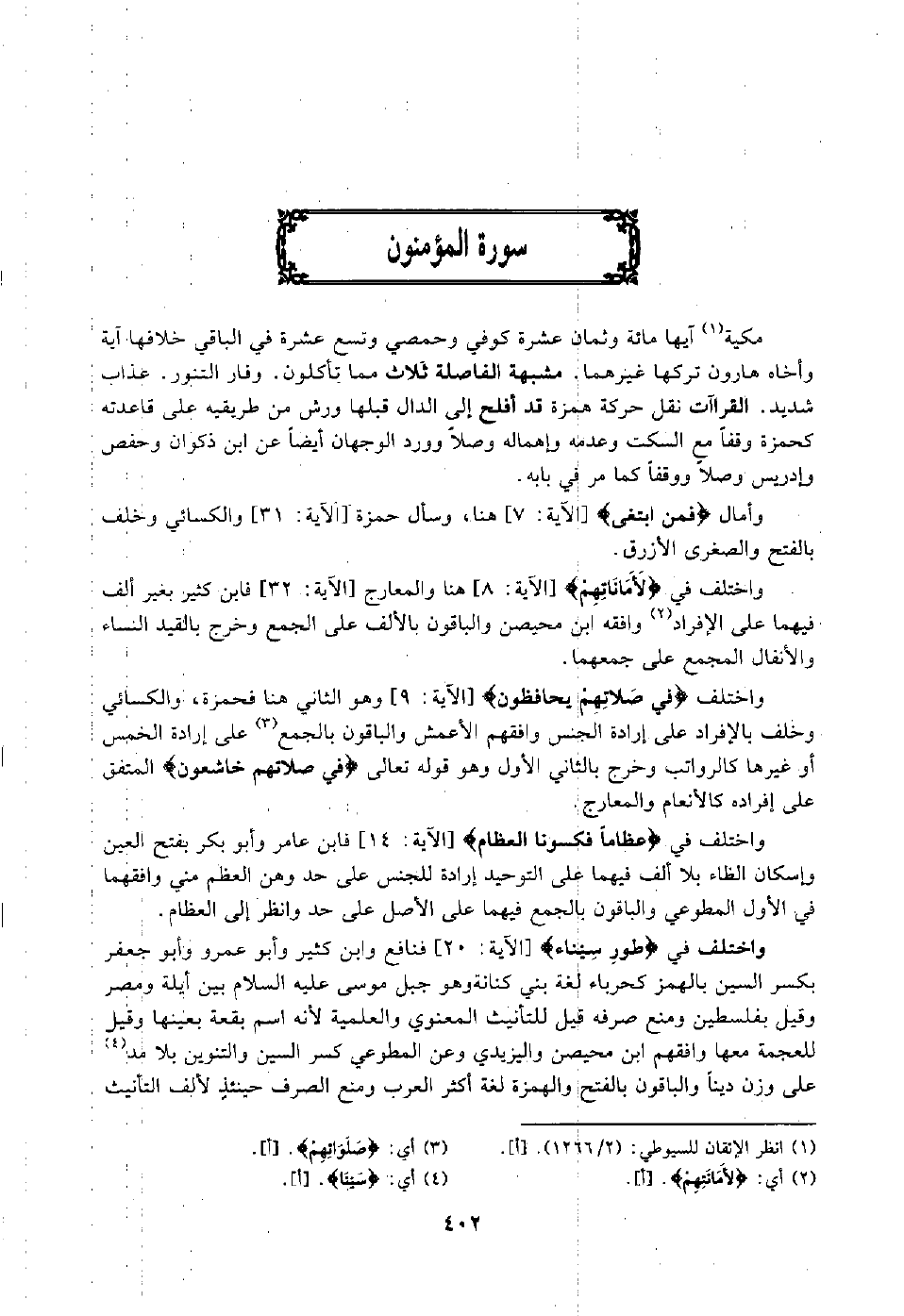 مكية1 آيها مائة وثمان عشرة كوفي وحمصي وتسع عشرة في الباقي, خلافها آية وأخاه هارون تركها غيرهما, مشبهة الفاصلة ثلاث: مما تأكلون, وفار التنور, عذاب شديد, القراءات نقل حركة همزة قد أفلح إلى الدال قبلها ورش من طريقيه على قاعدته كحمزة وقفا مع السكت وعدمه, وإهماله وصلا, وورد الوجهان أيضا عن ابن ذكوان وحفص وإدريس وصلا ووقفا كما مر في بابه.