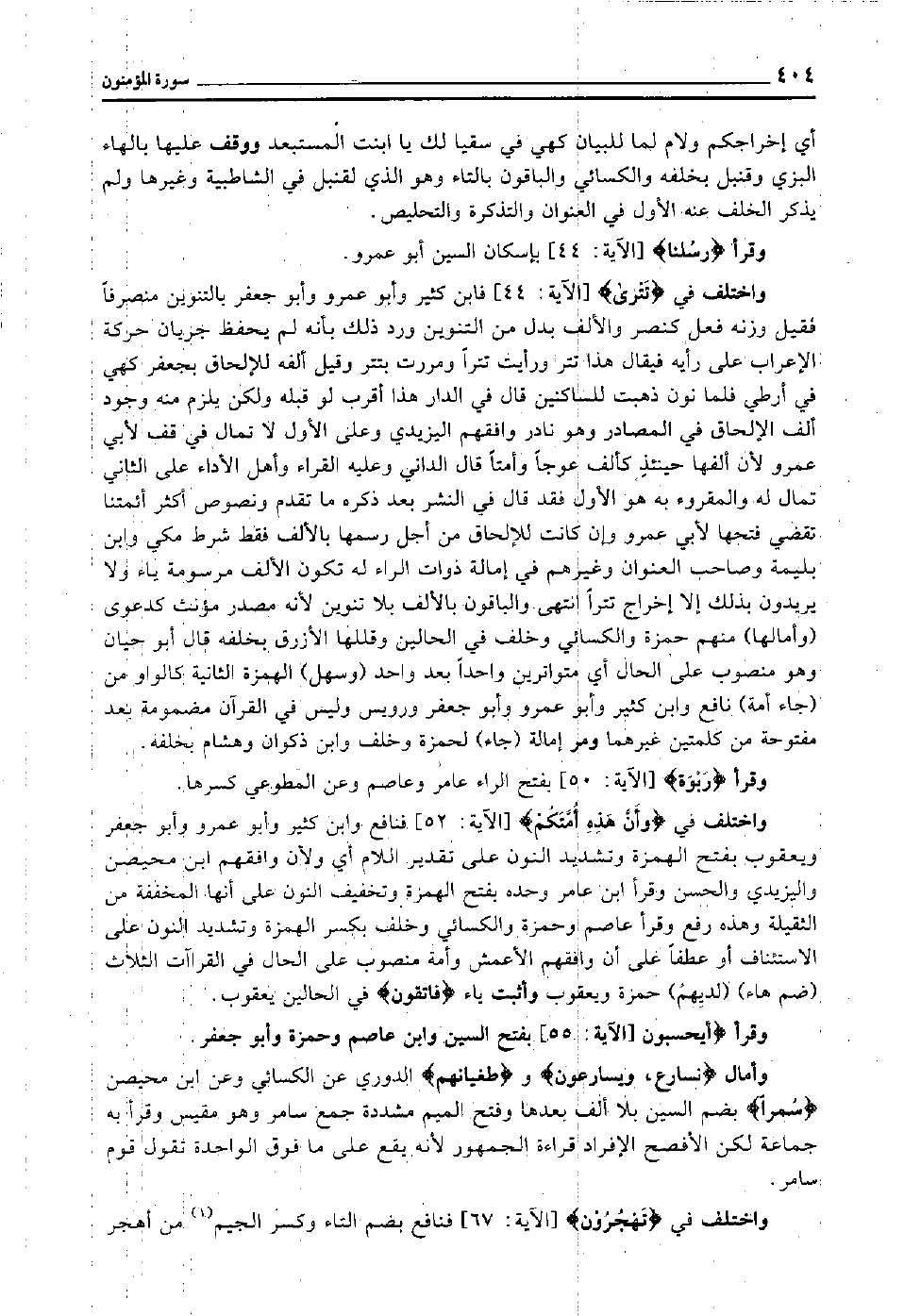 واختلف في "وَإِنَّ هَذِهِ أُمَّتُكُم" [الآية: 52] فنافع وابن كثير وأبو عمرو وأبو جعفر ويعقوب بفتح الهمزة وتشديد النون على تقدير اللام أي: ولأن وافقهم ابن محيصن واليزيدي والحسن, وقرأ ابن عامر وحده بفتح الهمزة وتخفيف النون على أنها المخففة من الثقيلة وهذه رفع, وقرأ عاصم وحمزة والكسائي وخلف بكسر الهمزة وتشديد النون على الاستئناف أو عطفا على أن وافقهم الأعمش, وأمة منصوب على الحال في القراءات الثلاث "ضم هاء" "لديهم" حمزة ويعقوب, وأثبت ياء "فاتقون" في الحالين يعقوب.