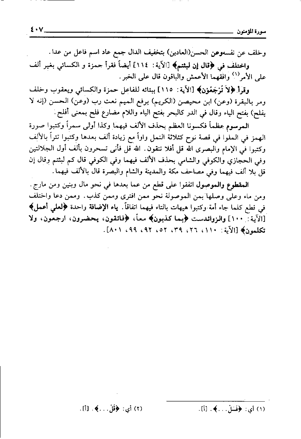 المقطوع والموصول اتفقوا على قطع من عما بعدها في نحو: مال وبنين ومن مارج ومن ماء, وعلى وصلها بمن الموصولة نحو: ممن افترى وممن كذب وممن دعا, واختلف في قطع كلما جاء أمة, وكتبوا هيهات بالتاء فيهما اتفاقا ياء الإضافة واحدة"لَعَلِّي أَعْمَل" [الآية: 100] والزوائد ست "بِمَا كَذَّبُون" معا "فاتقون، يحضرون, ارجعون، ولا تكلمون" [الآية: 110، 26، 39، 52، 92، 99، 801] .