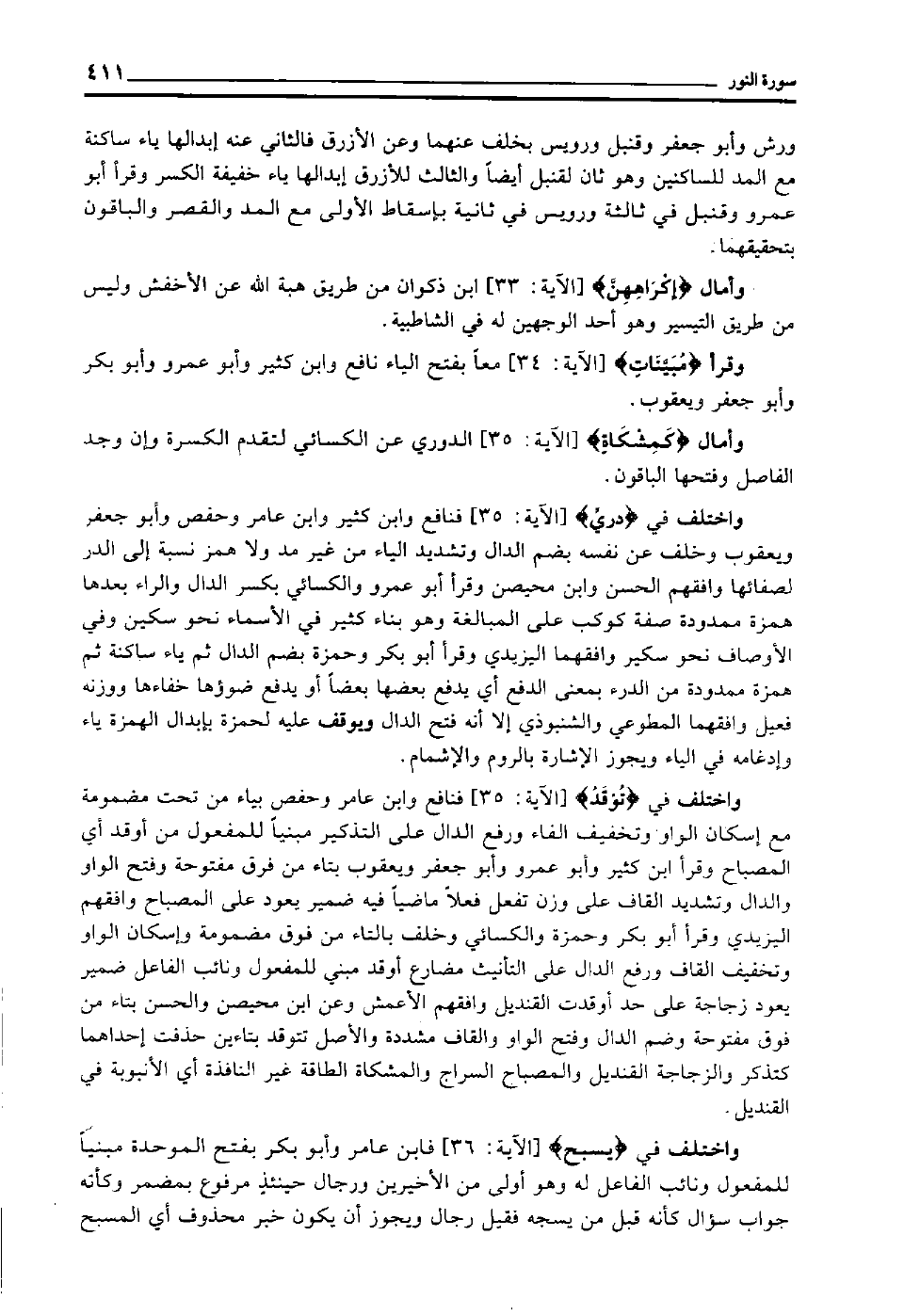 واختلف في "تُوقَد" [الآية: 35] فنافع وابن عامر وحفص بياء من تحت مضمومة مع إسكان الواو وتخفيف الفاء ورفع الدال على التذكير مبنيا للمفعول من أوقد أي: المصباح, وقرأ ابن كثير وأبو عمرو وأبو جعفر ويعقوب بتاء من فرق مفتوحة, وفتح الواو والدال وتشديد القاف على وزن تفعل فعلا ماضيا فيه ضمير يعود على المصباح وافقهم اليزيدي, وقرأ أبو بكر وحمزة والكسائي وخلف بالتاء من فوق مضمومة وإسكان الواو وتخفيف القاف ورفع الدال على التأنيث مضارع أوقد مبني للمفعول ونائب الفاعل ضمير يعود زجاجة على حد أوقدت القنديل, وافقهم الأعمش, وعن ابن محيصن والحسن بتاء من فوق مفتوحة وضم الدال وفتح الواو والقاف مشددة والأصل تتوقد بتاءين حذفت إحداهما كتذكر, والزجاجة القنديل والمصباح السراج والمشكاة الطاقة غير النافذة أي: الأنبوبة في القنديل.