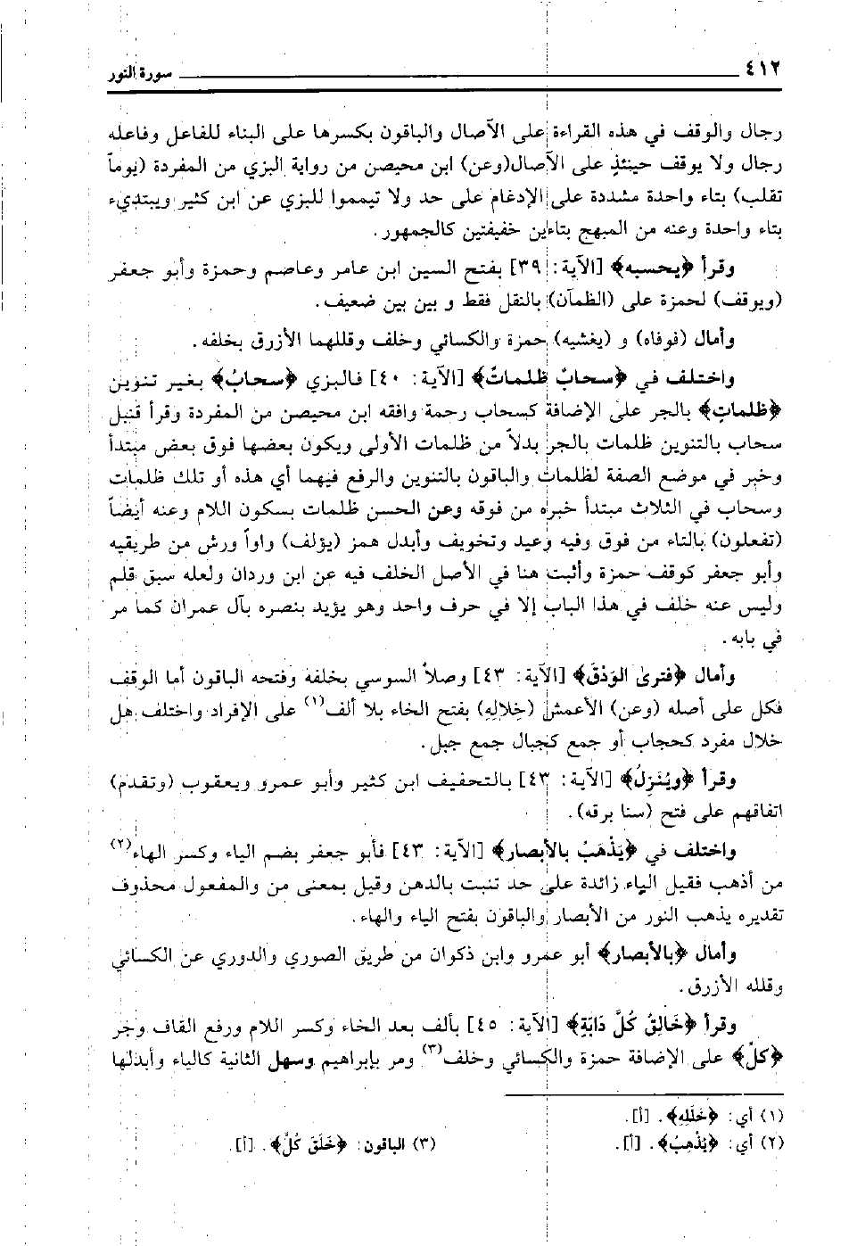 وقرأ "خالق كل دابة" [الآية: 45] بألف بعد الخاء وكسر اللام ورفع القاف وجر "كل" على الإضافة حمزة والكسائي وخلف3 ومر بإبراهيم وسهل الثانية كالياء وأبدلها.
