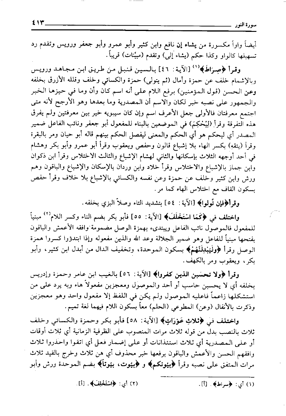 واختلف في "كَمَا اسْتَخْلَف" [الآية: 55] فأبو بكر بضم التاء وكسر اللام2 مبنيا للمفعول, فالموصول نائب الفاعل, ويبتدئ بهمزة الوصل مضمومة, وافقه الأعمش, والباقون بفتحها مبنيا للفاعل, وهو ضمير الجلالة وعد الله والذين مفعوله, وإذا ابتدءوا كسروا همزة الوصل, وقرأ "وَلَيُبْدِلَنَّهُم" بسكون الموحدة وتخفيف الدال من أبدل ابن كثير وأبو بكر ويعقوب ومر بالكهف.