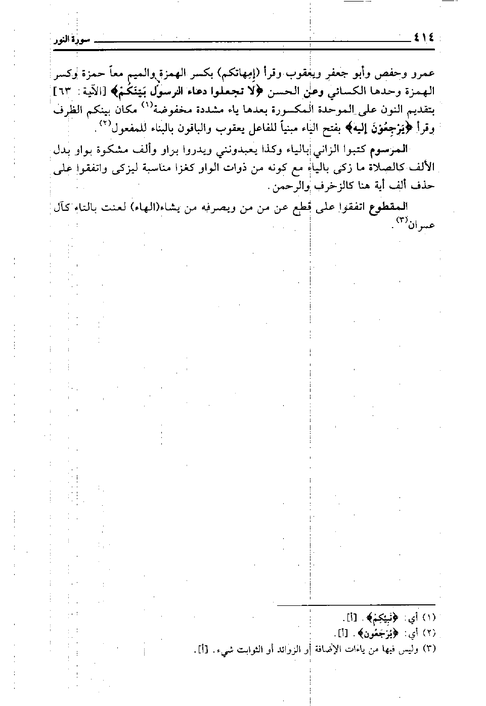 عمرو وحفص وأبو جعفر ويعقوب وقرأ "إمهاتكم" بكسر الهمزة والميم معا حمزة وكسر الهمزة وحدها الكسائي, وعن الحسن "لا تجعلوا دعاء الرسول بينكم" [الآية: 63] بتقديم النون على الموحدة المكسورة بعدها ياء مشددة مخفوضة1 مكان بينكم الظرف, وقرأ "يرجعون إليه" بفتح الياء مبنيا للفاعل يعقوب, والباقون بالبناء للمفعول2.