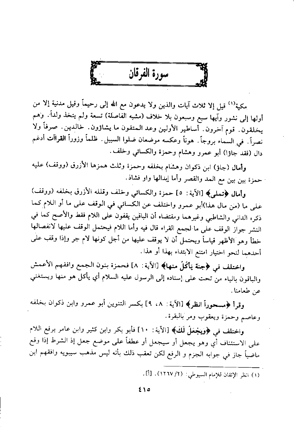 مكية1 قيل إلا ثلاث آيات: والذين ولا يدعون مع الله إلى رحيما’ وقيل مدنية إلا من أولها إلى نشور, وآيها سبع وسبعون بلا خلاف, طمشبه الفاصلة" تسعة: ولم يتخذ ولدا, وهم يخلقون, قوم آخرون, أساطير الأولين, وعد المتقون, ما يشاؤون, خالدين, صرفا ولا نصرا, في السماء بروجا, هونا, وعكسه موضعان: ضلوا السبيل ظلما وزورا, القراءات أدغم دال "فقد جاؤا" أبو عمرو وهشام وحمزة والكسائي وخلف.