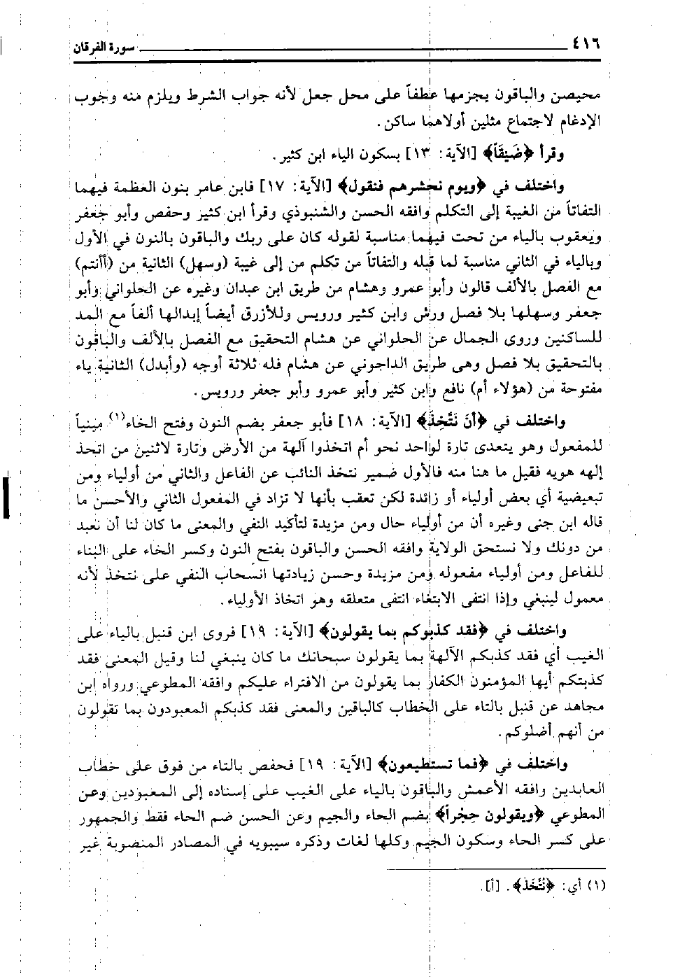 واختلف في "فَمَا تَسْتَطِيعُون" [الآية: 19] فحفص بالتاء من فوق على خطاب العابدين, وافقه الأعمش, والباقون بالياء على الغيب على إسناده إلى المعبودين, وعن المطوعي "وَيَقُولُونَ حِجْرًا" بضم الحاء والجيم وعن الحسن ضم الحاء فقط, والجمهور على كسر الحاء وسكون الجيم, وكلها لغات, وذكره سيبويه في المصادر المنصوبة غير