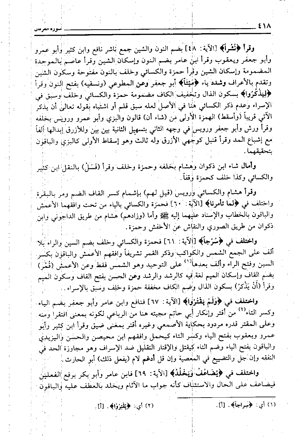 واختلف في "سُرُجا" [الآية: 61] فحمزة والكسائي وخلف بضم السين والراء بلا ألف على الجمع الشمس والكواكب, وذكر القمر تشريفا وافقهم الأعمش, والباقون بكسر السين وفتح الراء وألف بعدها1 على التوحيد وهو الشمس فقط, وعن الأعمش "قُمْر" بضم القاف وإسكان الميم لغة فيه كالرشد والرشد, وعن الحسن بفتح القاف وسكون الميم, وقرأ "أن يذكر" بسكون الذال وضم الكاف مخففة حمزة وخلف وسبق بالإسراء.