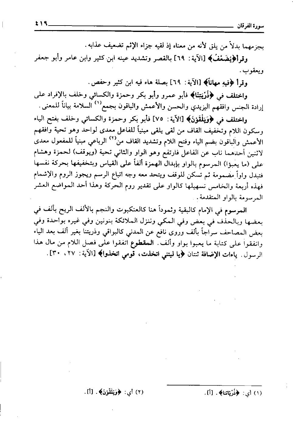 المرسوم في الإمام كالبقية وثمودا هنا كالعنكبوت والنجم بالألف الريح بألف في بعضها, وبالحذف في بعض وفي المكي وننزل الملائكة بنونين, وفي غيره بواحدة وفي بعض المصاحف سراجا بألف, وروى نافع عن المدني كالبواقي وذريتنا بغير ألف بعد الياء, واتفقوا على كتابة ما يعبوا بواو وألف. المقطوع اتفقوا على فصل اللام من مال هذا الرسول. ياءات الإضافة ثنتان: "يا ليتني اتخذت، قومي اتخذوا" [الآية: 27، 30] .