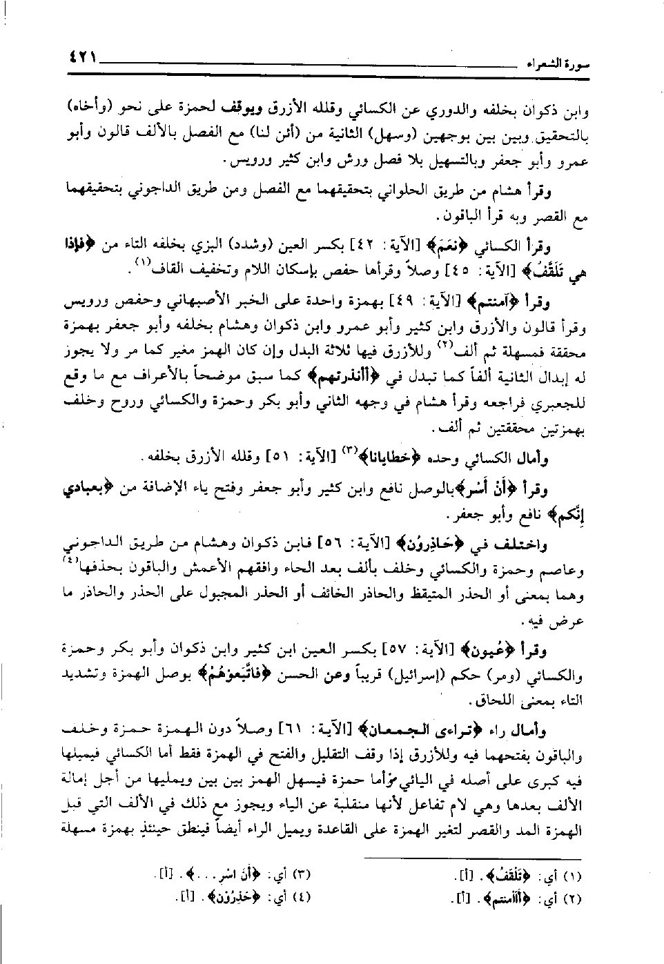 واختلف في "حاذرون" [الآية: 56] فابن ذكوان وهشام من طريق الداجوني وعاصم وحمزة والكسائي وخلف بألف بعد الحاء, وافقهم الأعمش, والباقون بحذفها4 وهما بمعنى أو الحذر المتيقظ والحاذر الخائف أو الحذر المجبول على الحذر, والحاذر ما عرض فيه.