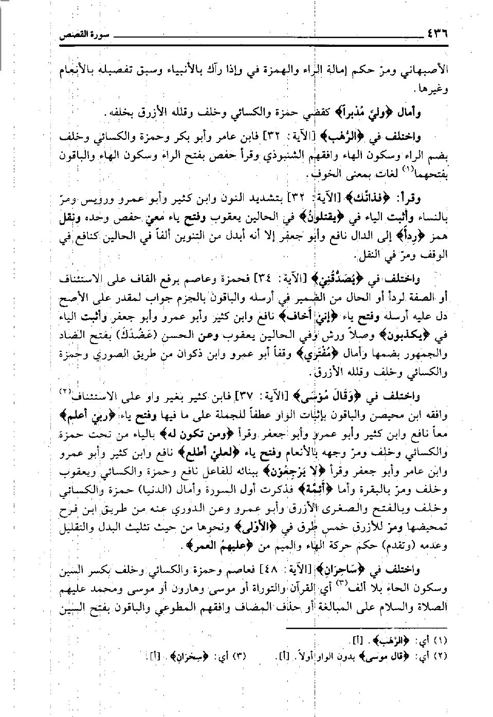 واختلف في "وَقَالَ مُوسَى" [الآية: 37] فابن كثير بغير واو على الاستئناف2, وافقه ابن محيصن والباقون بإثبات الواو عطفا للجملة على ما فيها, وفتح ياء "رَبِّي أَعْلَم" معا نافع وابن كثير وأبو عمرو وأبو جعفر, وقرأ "وَمَنْ تَكُونُ لَه" بالياء من تحت حمزة والكسائي وخلف ومر وجهه بالأنعام وفتح ياء "لَعَلِّي أَطَّلِع" نافع وابن كثير وأبو عمرو وابن عامر وأبو جعفر, وقرأ "لا يَرْجِعُون" ببنائه للفاعل نافع وحمزة والكسائي ويعقوب وخلف ومر بالبقرة, وأما "أئمة" فذكرت أول السورة, وأمال "الدنيا" حمزة والكسائي وخلف وبالفتح والصغرى الأزرق وأبو عمرو وعن الدوري عنه من طريق ابن فرح تمحيضها, ومر للأزرق خمس طرق في "الأولى" ونحوها من حيث تثليث البدل والتقليل وعدمه "وتقدم" حكم حركة الهاء والميم من "عَلَيْهِمُ الْعُمُر".