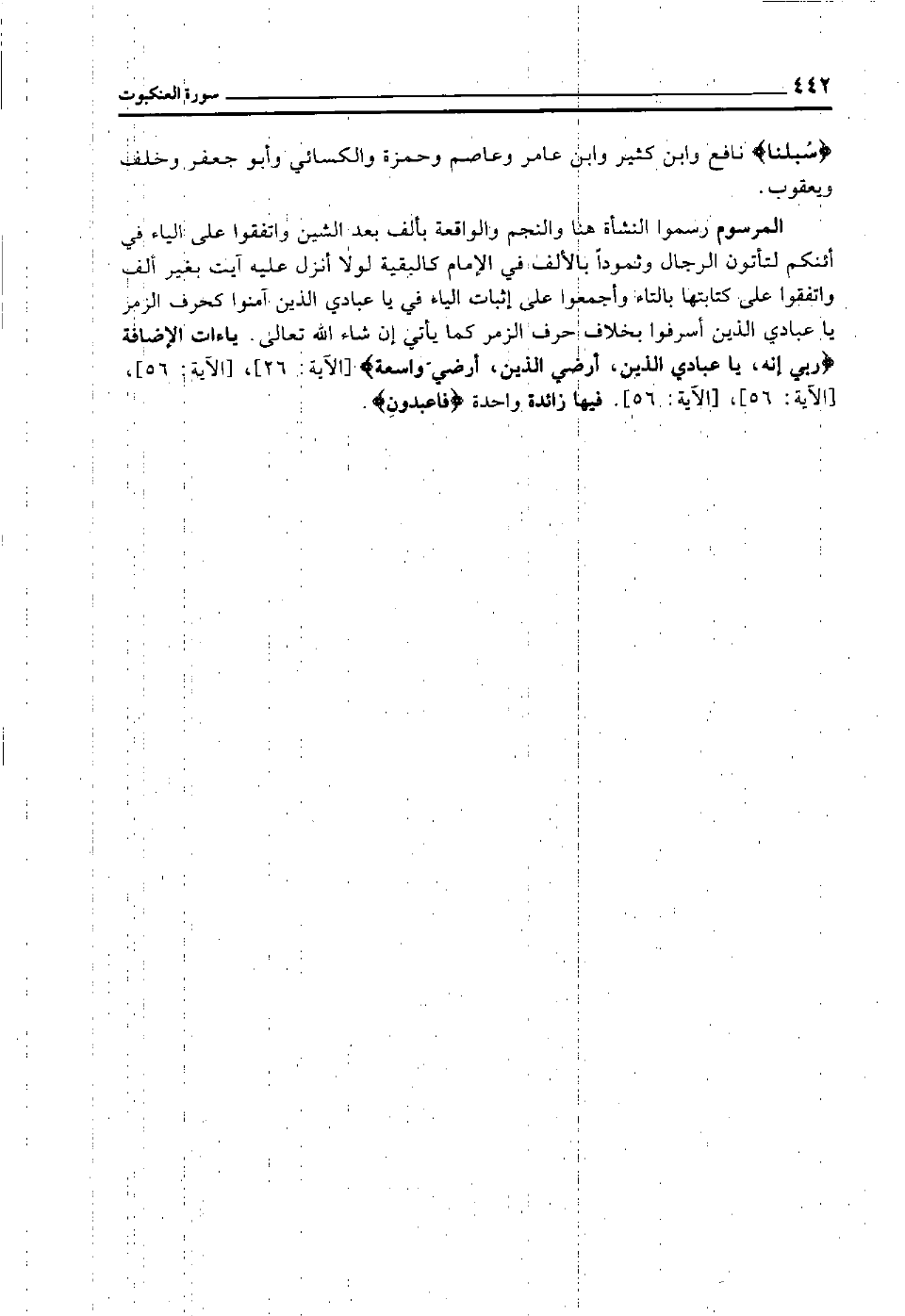 المرسوم رسموا النشأة هنا والنجم والواقعة بألف بعد الشين, واتفقوا على الياء في أئنكم لتأتون الرجال وثمودا بالألف في الإمام كالبقية لولا أنزل عليه آيت بغير ألف, واتفقوا على كتابتها بالتاء, وأجمعوا على إثبات الياء في يا عبادي الذي آمنوا كحرف الزمر يا عبادي الذين أسرفوا بخلاف حرف الزمر كما يأتي إن شاء الله تعالى. ياءات الإضافة: "رَبِّي إِنَّه, يَا عِبَادِيَ الَّذِين, أرضي الذين، أرضي واسعة" [الآية: 26] , [الآية: 56] , [الآية: 56] , [الآية: 56] فيها زائدة واحدة "فاعبدون".