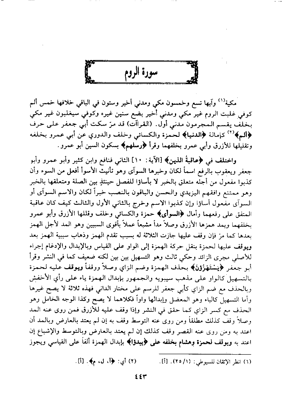 مكية1 وآيها تسع وخمسون مكي ومدني أخير وستون في الباقي خلافها خمس ألم كوفي غلبت الروم غير مكي ومدني أخير بضع سنين غيره وكوفي سيغلبون غير مكي بخلف يقسم المجرمون مدني أول "القراءات" قد مر سكت أبي جعفر على حرف "الم"2 كإمالة "الدنيا" لحمزة والكسائي وخلف والدوري عن أبي عمرو بخلفه, وتقليها للأزرق وأبي عمرو بخلفهما, وقرأ "رسلهم" بسكون السين أبو عمرو.