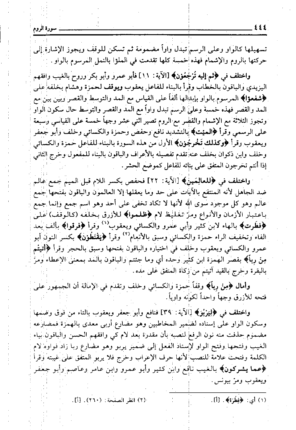 واختلف في "ليربو" [الآية: 39] فنافع وأبو جعفر ويعقوب بالتاء من فوق وضمها وسكون الواو على إسناده لضمير المخاطبين, وهو مضارع أربى معدى بالهمزة فمضارعه مضموم حذفت منه نون الرفع لنصبه بأن مقدرة بعد لام كي, وافقهم الحسن, والباقون بياء الغيب وفتحها وفتح الواو لإسناد الفعل إلى ضمير يربو, وهو مضارع ربا زاد فواوه لام الكلمة وفتحت علامة للنصب؛ لأنها حرف الإعراب وخرج فلا يربو المتفق على غيبته, وقرأ "عَمَّا يُشْرِكُون" بالغيب نافع وابن كثير وأبو عمرو وابن عامر وعاصم وأبو جعفر ويعقوب ومر بيونس.