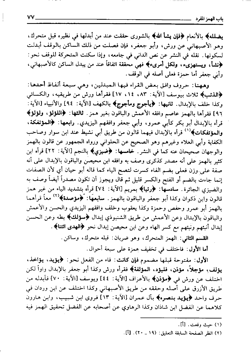 الأول: مفتوحة قبلها مضموم فإن كانت فاء من الفعل نحو: "يؤيد، يؤاخذ، يؤلف، مؤجلا، مؤذن، فليؤد، المؤلفة" فقرأه ورش وكذا أبو جعفر بالإبدال واوا لكن اختلف عن ورش في "مؤذن" [الأعراف الآية: 44] و [يوسف الآية: 70] فأبدله من طريق الأزرق على أصله وحققه من طريق الأصبهاني, وكذا اختلف عن ابن وردان في حرف واحد "يُؤَيِّدُ بِنَصْرِه" [آل عمران الآية: 13] فروى ابن شبيب وابن هارون كلاهما عن الفضل ابن شاذان وكذا الرهاوي عن أصحابه عن الفضل تحقيق الهمز فيه