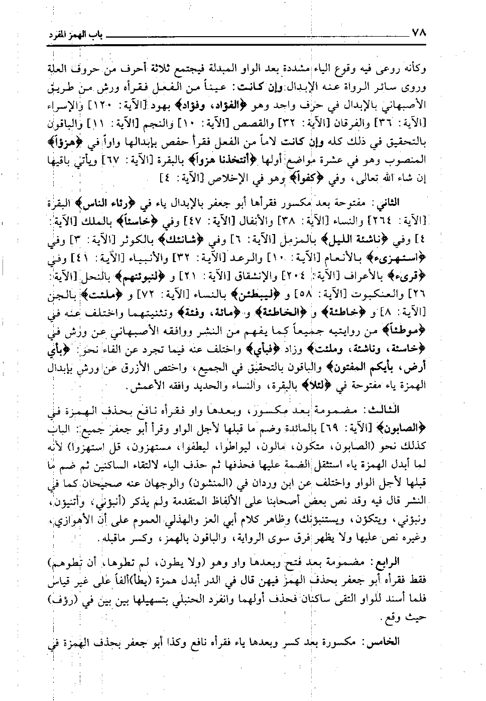 الثاني: مفتوحة بعد مكسور فقرأها أبو جعفر بالإبدال ياء في "رِئَاءَ النَّاس" [البقرة الآية: 264] و [النساء الآية: 38] و [الأنفال الآية: 47] وفي "خاسئا" [الملك الآية: 4] وفي "نَاشِئَةَ اللَّيْل" [المزمل الآية: 6] وفي "شانئك" [الكوثر الآية: 3] وفي "استهزئ" [الأنعام الآية: 10] و [الرعد الآية: 32] و [الأنبياء الآية: 41] وفي "قرئ" [الأعراف الآية: 204] و [الإنشقاق الآية: 21] و"لنبوئنهم" [النحل الآية: 26] و [العنكبوت الآية: 58] و"ليبطئن" [النساء الآية: 72] و"ملئت" [الجن الآية: 8] و"خاطئة" و"الخاطئة" و"مائة، وفئة" وتثنيتهما واختلف عنه في "موطئا" من روايتيه جميعا كما يفهم من النشر, ووافقه الأصبهاني عن ورش في "خاسئة، وناشئة، وملئت" وزاد "فبأي" واختلف عنه فيما تجرد عن الفاء نحو: "بأي، أرض، بأيكم، المفتون" والباقون بالتحقيق في الجميع واختص الأزرق عن ورش بإبدال الهمزة ياء مفتوحة في "لئلا" "بالبقرة، والنساء، والحديد وافقه الأعمش.