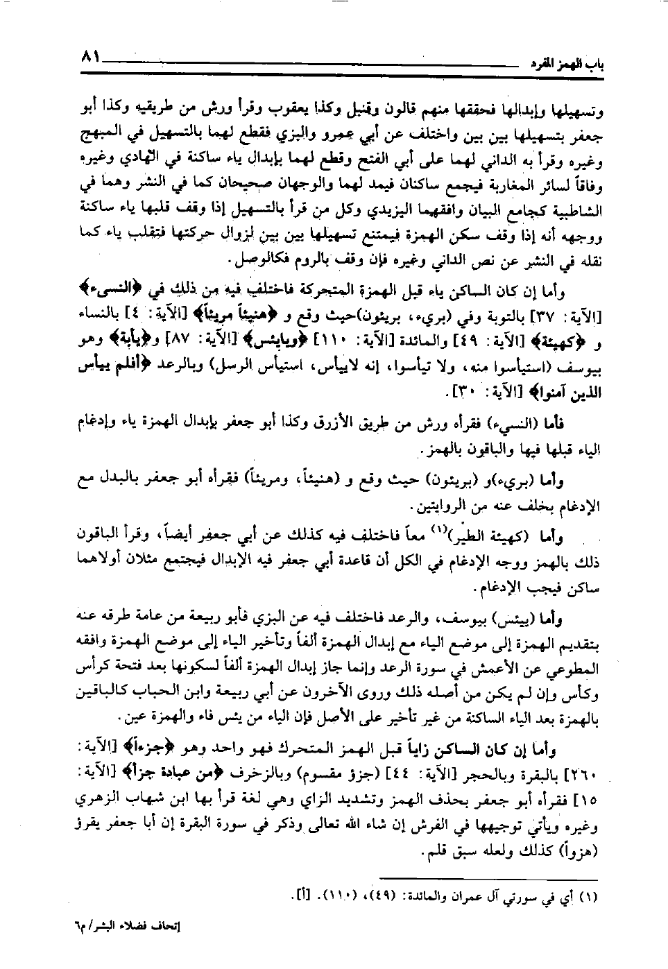 وأما "بريء" و"بريئون" حيث وقع و"هنيئا, ومريئا" فقرأه أبو جعفر بالبدل مع الإدغام بخلف عنه من الروايتين.