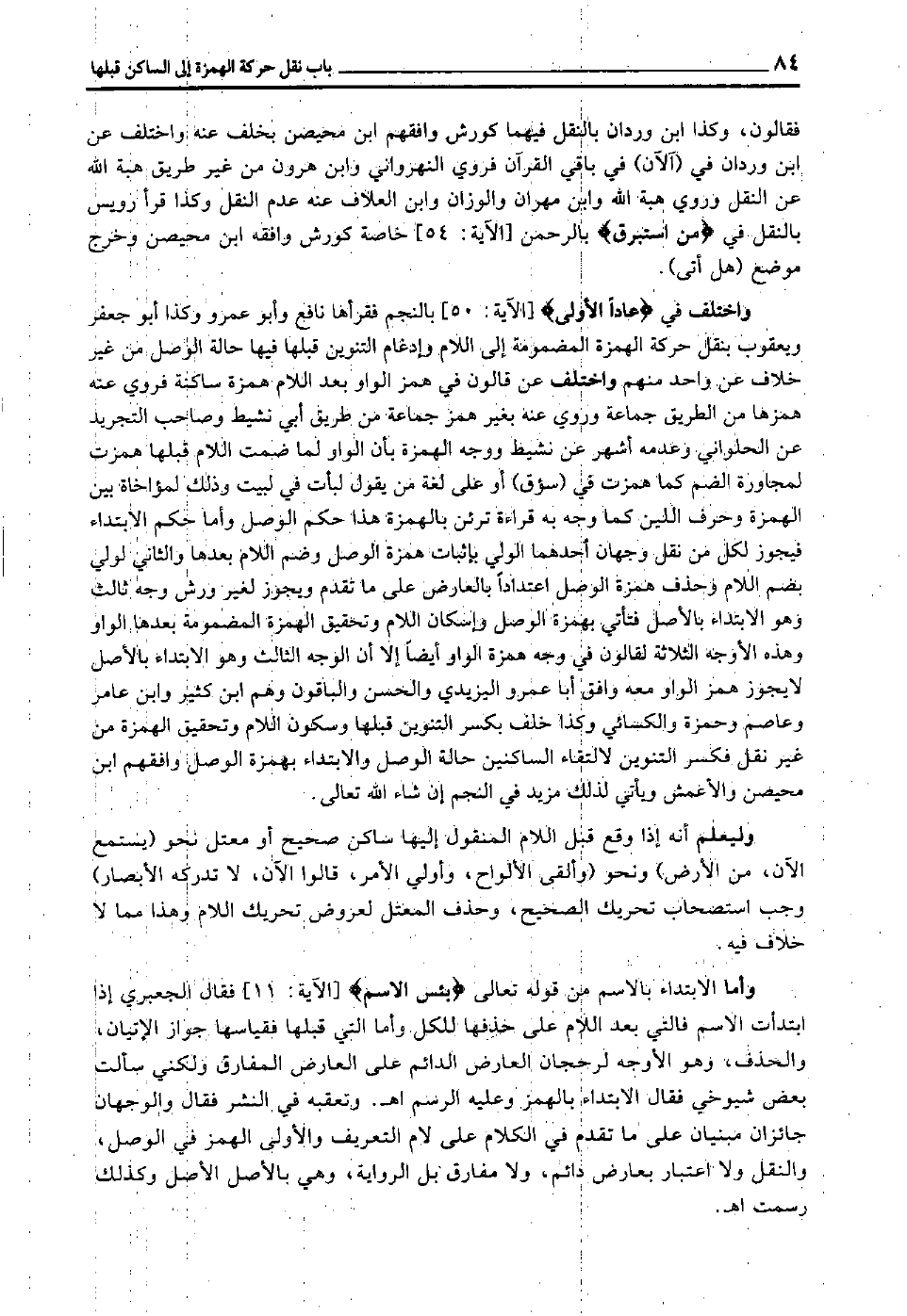 وليعلم أنه إذا وقع قبل اللام المنقول إليها ساكن صحيح أو معتل نحو: "يستمع الآن, من الأرض" ونحو: "وألقى الألواح, وأولي الأمر, قالوا الآن, لا تدركه الأبصار" وجب استصحاب تحريك الصحيح وحذف المعتل لعروض تحريك اللام, وهذا مما لا خلاف فيه.