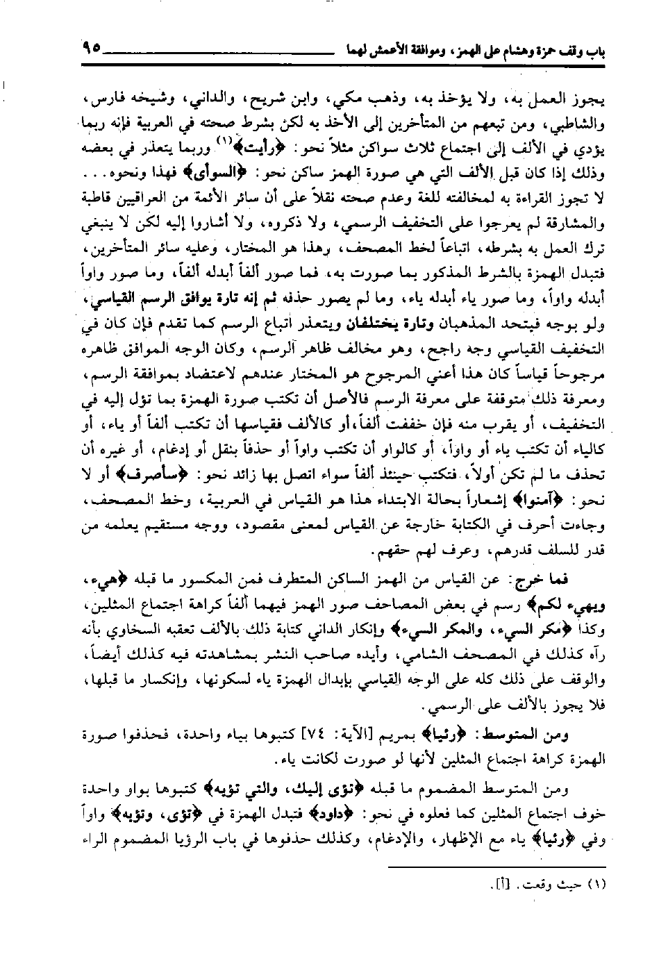 فما خرج عن القياس من الهمز الساكن المتطرف فمن المكسور ما قبله "هيء، ويهيء لكم" رسم في بعض المصاحف صور الهمز فيهما ألفا كراهة اجتماع المثلين وكذا "مكر السيء، والمكر السيء" وإنكار الداني كتابة ذلك بالألف تعقبه السخاوي بأنه رآه كذلك في المصحف الشامي, وأيده صاحب النشر بمشاهدته فيه كذلك أيضا, والوقف على ذلك كله على الوجه القياسي بإبدال الهمزة ياء لسكونها وإنكسار ما قبلها فلا يجوز بالألف على الرسمي.