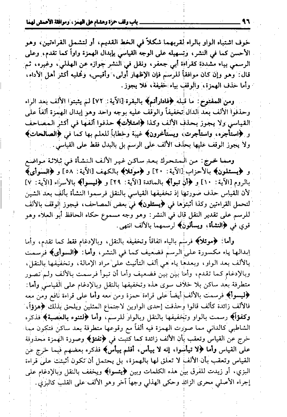 ومما خرج: من المتحرك بعد ساكن غير الألف النشأة في ثلاثة مواضع و"يسألون" [الأحزاب الآية: 20] و"موئلا" [الكهف الآية: 58] و"السوأى" [الروم الآية: 10] و"أن تبوأ" [المائدة الآية: 29] و"ليسوا" [الإسراء الآية: 7] لأن القياس حذف صورتها إذ تخفيفها القياسي بالنقل فرسموا النشأة بألف بعد الشين لتحمل القراءتين, وكذا أثبتوها في "يسألون" في بعض المصاحف فيجوز الوقف بالألف للرسم على تقدير النقل, قال في النشر: وهو وجه مسموع حكاه الحافظ أبو العلاء وهو قوي في "النشأة، ويسألون" لرسمهما بالألف ا. هـ.