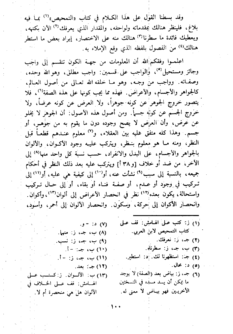 اعلموا وفقكم الله أن المعلومات من جهة الكون تنقسم إلى واجب وجائز ومستحيل (¬5)، والواجب على قسمين: واجب مطلق، وهوالله وحده، وصفاته. وواجب من وجه، وهو ما خلقه الله تعالى من أصول العالم، كالجواهر والأجسام، والأعراض. فهذه مما يجب كونها على هذه الصفة (¬6)، فلا يتصور خروج الجوهر عن كونه جوهرا، ولا العرض عن كونه عرضا، ولا خروج الجسم عن كونه جسما. ومن أصول هذه الأصول: أن الجوهر لا يخلو عن عرض، وأن العرض لا يصح وجوده دون ما يقوم به من جوهر، أو جسم. وهذا كله متفق عليه بين العقلاء، و (¬7) معلوم عندهم قطعا قبل النظر، ومنه ما هو معلوم بنظر، ويتركب عليه وجود الأكوان، والألوان بالجواهر والأجسام، على البدل والانفراد، حسب نسبة كل واحد منها (¬8) إلى الآخر، من ضد أو خلاف [و 38 أ] ويتركب عليه بعد ذلك النظز في أحكام جميعه، بالنسبة إلى سبب (¬9) نشأت عنه، أو (¬10) إلى كيفية هي عليه، أو (¬11) إلى تركيب في وجود أو عدم، أو صفة فناء أو بقاء، أو إلى حال تركيب واستحالة، يكون بعده (¬12) نظر في انحصار الأعراض إلى ألوان (¬13)، وأكوان. وانحصار الأكوان إلى حركة، وسكون. وانحصار الألوان إلى أحمر، وأسود،