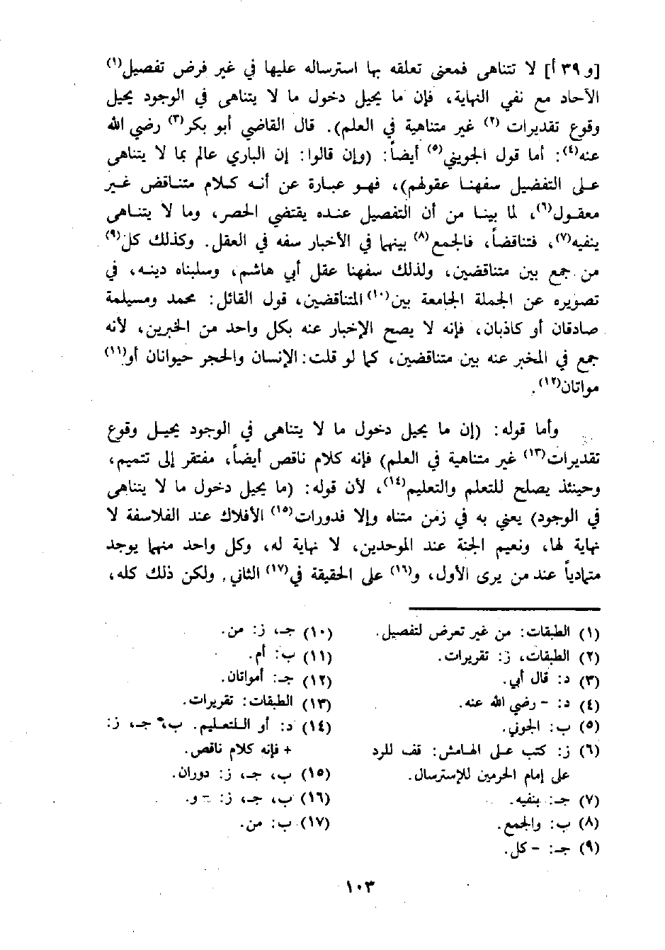 [و 39 أ] لا تتناهى فمعنى تعلقه بها استرساله عليها في غير فرض تفصيل (¬1) الآحاد مع نفي النهاية، فإن ما يحيل دخول ما لا يتناهى في الوجود يحيل وقوع تقديرات (¬2) غير متناهية في العلم). قال القاضي أبو بكر (¬3) رضي الله عنه (¬4): أما قول الجويني (¬5) أيضا: (وإن قالوا: إن الباري عالم بما لا يتناهى على التفضيل سفهنا عقولهم)، فهو عبارة عن أنه كلام متناقض غير معقول (¬6)، لما بينا من أن التفصيل عنده يقتضي الحصر، وما لا يتناهى ينفيه (¬7)، فتناقضا، فالجمع (¬8) بينهما في الأخبار سفه في العقل. وكذلك كل (¬9) من جمع بين متناقضين، ولذلك سفهنا عقل أبي هاشم، وسلبناه دينه، في تصويره عن الجملة الجامعة بين (¬10) المتناقضين، قول القائل: محمد ومسيلمة صادقان أو كاذبان، فإنه لا يصح الإخبار عنه بكل واحد من الخبرين، لأنه جمع في الخبر عنه بين متناقضين، كما لو قلت: الإنسان والحجر حيوانان أو (¬11) مواتان (¬12).