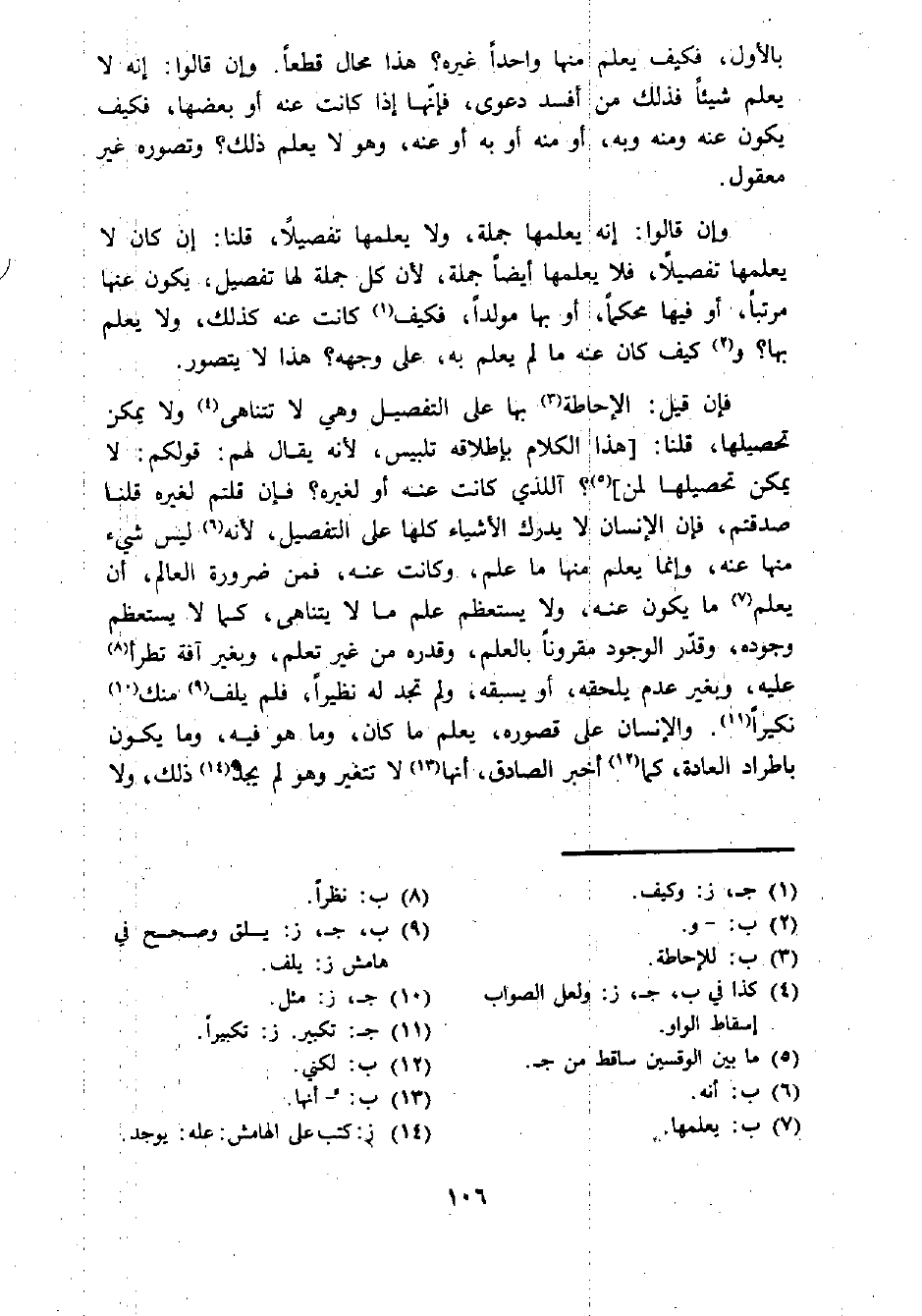 فإن قيل: الإحاطة (¬3) بها على التفصيل وهي لا تتناهى (¬4) ولا يمكن تحصيلها، قلنا: [هذا الكلام بإطلاقه تلبيس، لأنه يقال لهم: قولكم: لا يمكن تحصيلها لمن] (¬5)؟ آللذي كانت عنه أو لغيره؟ فإن قلتم لغيره قلت صدقتم، فإن الإنسان لا يدرك الأشياء كلها على التفصيل، لأنه (¬6) ليس شيء منها عنه، وإنما يعلم منها ما علم، وكانت عنه، فمن ضرورة العالم، أن يعلم (¬7) ما يكون عنه، ولا يستعظم علم ما لا يتناهى، كما لا يستعظم وجوده، وقدر الوجود مقرونا بالعلم، وقدره من غير تعلم، وبغير آفة تطرأ (¬8) عليه، وبغير عدم يلحقه، أو يسبقه، ولم تجد له نظيرا، فلم يلف (¬9) منك (¬10) نكيرا (¬11). والإنسان على قصوره، يعلم ما كان، وما هو فيه، وما يكون باطراد العادة، كما (¬12) أخبر الصادق، أنها (¬13) لا تتغير وهو لم يجد (¬14) ذلك، ولا