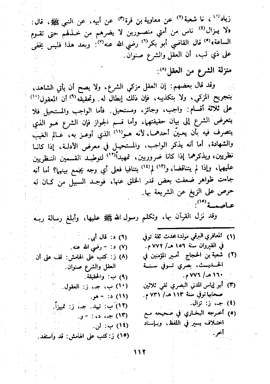 زياد (¬1)، نا شعبة (¬2) عن معاوية بن قرة (¬3) عن أبيه، عن النبي - صلى الله عليه وسلم -، قال: "لا يزال (¬4) ناس من أمتي منصورين لا يضرهم من خذلهم حتى تقوم، الساعة" (¬5) قال القاضي أبو بكر (¬6) رضي الله عنه (¬7): وبعد هذا فليس يخفى على ذي لب، أن العقل والشرع صنوان.