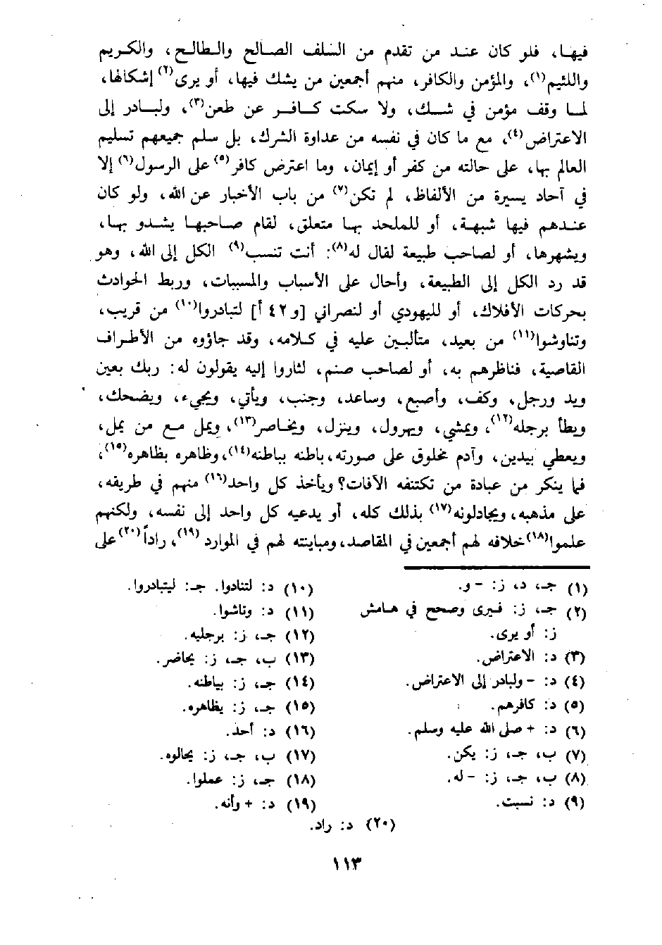 فيها، فلو كان عند من تقدم من السلف الصالح والطالح، والكريم واللئيم (¬1)، والمؤمن والكافر، منهم أجمعين من يشك فيها، أو يرى (¬2) إشكالها، لما وقف مؤمن في شك، ولا سكت كافر عن طعن (¬3)، ولبادر إلى الاعتراض (¬4)، مع ما كان في نفسه من عداوة الشرك، بل سلم جميعهم تسليم العالم بها، على حالته من كفر أو إيمان، وما اعترض كافر (¬5) على الرسول (¬6) إلا في آحاد يسيرة من الألفاظ، لم تكن (¬7) من باب الأخبار عن الله، ولو كان عندهم فيها شبهة، أو للملحد بها متعلق، لقام صاحبها يشدو بها، ويشهرها، أو لصاحب طبيعة لقال له (¬8): أنت تنسب (¬9) الكل إلى الله، وهو قد رد الكل إلى الطبيعة، وأحال على الأسباب والمسببات، وربط الحوادث بحركات الأفلاك، أو لليهودي أو لنصراني [و 42 أ] لتبادروا (¬10) من قريب، وتناوشوا (¬11) من بعيد، متألبين عليه في كلامه، وقد جاؤوه من الأطراف القاصية، فناظرهم به، أو لصاحب صنم، لثاروا إليه يقولون له: ربك بعين ويد ورجل، وكف، وأصبع، وساعد، وجنب، ويأتي، ويجيء، ويضحك، ويطأ برجله (¬12)، ويمشي، ويهرول، وينزل، ويخاصر (¬13)، ويمل مع من يمل، ويعطي بيدين، وآدم مخلوق على صورته، باطنه بباطنه (¬14)، وظاهره بظاهره (¬15)، فما ينكر من عبادة من تكتنفه الآفات؟ ويأخذ كل واحد (¬16) منهم في طريقه، على مذهبه، ويجادلونه (¬17) بذلك كله، أو يدعيه كل واحد إلى نفسه، ولكنهم علموا (¬18) خلافه لهم أجمعين في المقاصد، ومباينته لهم في الموارد (¬19)، رادا (¬20) على