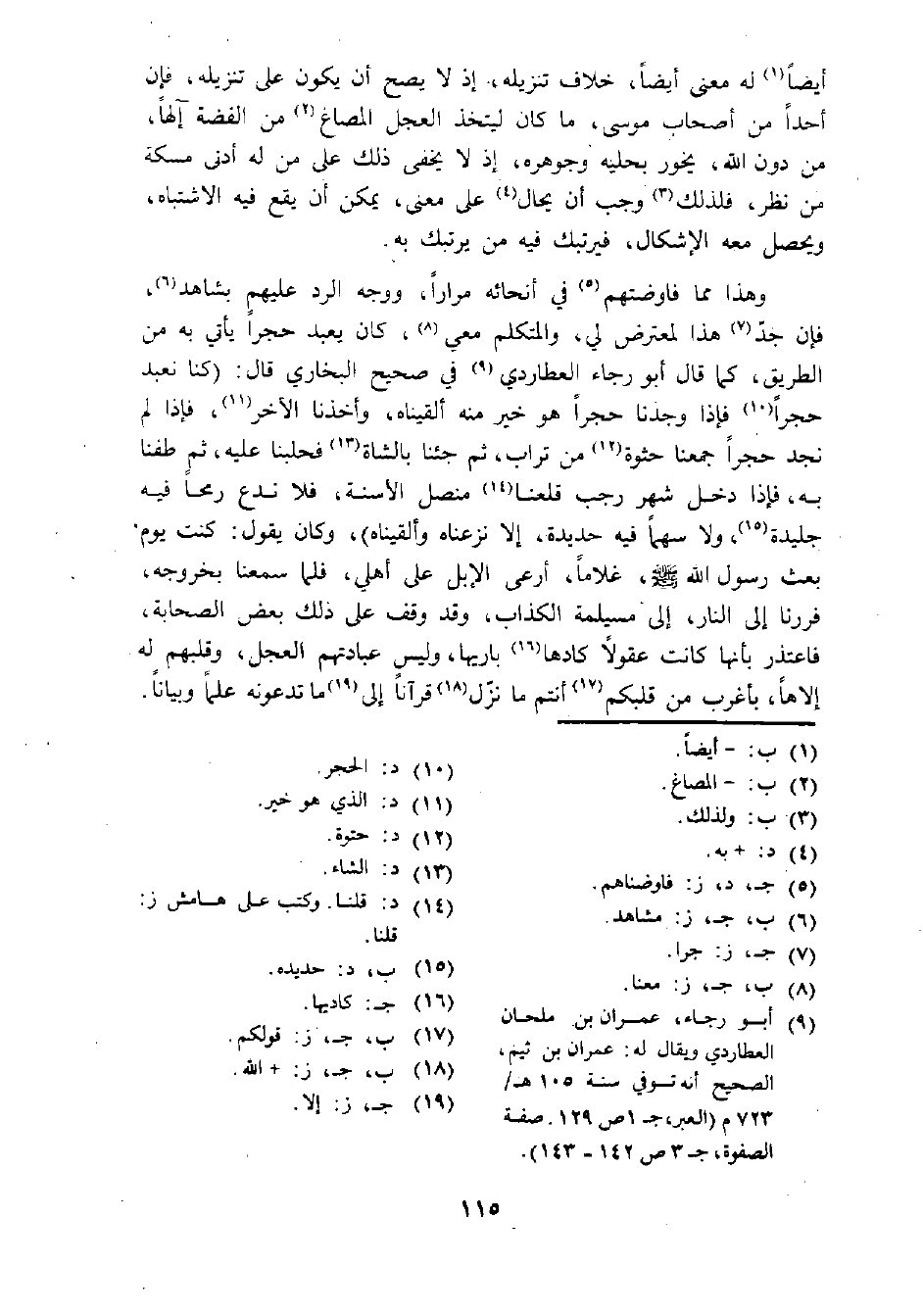 وهذا مما فاوضتهم (¬5) في أنحائه مرارا، ووجه الرد عليهم بشاهد (¬6)، فإن جد (¬7) هذا لمعترض لي، والمتكلم معي (¬8)، كان يعبد حجرا يأتي به من الطريق، كما قال أبو رجاء العطاردي (¬9) في صحيح البخاري قال: (كنا نعبد حجرا (¬10) فإذا وجدنا حجرا هو خير منه ألقيناه، وأخذنا الآخر (¬11)، فإذا لم نجد حجرا جمعنا حثوة (¬12) من تراب، ثم جئنا بالشاة (¬13) فحلبنا عليه، ثم طفنا به، فإذا دخل شهر رجب قلعنا (¬14) منصل الأسنة، فلا ندع رمحا فيه جليدة (¬15)، ولا سيما فيه حديدة، إلا نزعناه وألقيناه)، وكان يقول: كنت يوم بعث رسول الله - صلى الله عليه وسلم -، غلاما، أرعى الإبل على أهلي، فلما سمعنا بخروجه، فررنا إلى النار، إلى مسيلمة الكذاب، وقد وقف على ذلك بعض الصحابة، فاعتذر بأنها كانت عقولا كادها (¬16) باريها، وليس عبادتهم العجل، وقلبهم له إلاها، بأغرب من قلبكم (¬17) أنتم ما نزل (¬18) قرآنا إلى (¬19) ما تدعونه علما وبيانا.