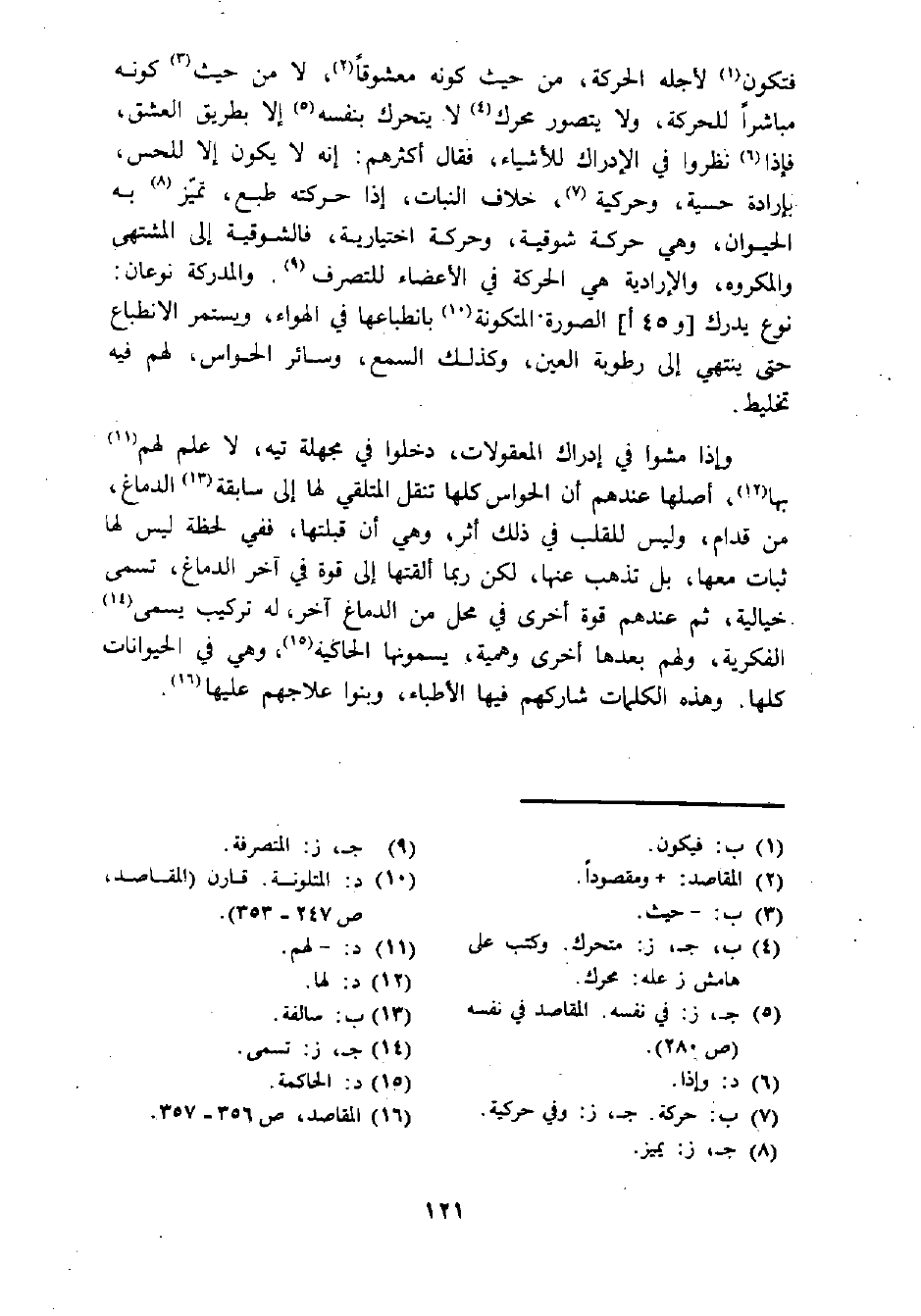 فتكون (¬1) لأجله الحركة، من حيث كونه معشوقا (¬2)، لا من حيث (¬3) كونه مباشرا للحركة، ولا يتصور محرك (¬4) لا يتحرك بنفسه (¬5) إلا بطريق العشق، فإذا (¬6) نظروا في الإدراك للأشياء، فقال أكثرهم: إنه لا يكون إلا للحس، بإرادة حسية، وحركية (¬7)، خلاف النبات، إذا حركته طبع، تميز (¬8) به الحيوان، وهي حركة شوقية، وحركة اختيارية، فالشوقية إلى المشتهى والمكروه، والإرادية هي الحركة في الأعضاء للتصرف (¬9). والمدركة نوعان: نوع يدرك [و 45 أ]، الصورة المتكونة (¬10) بانطباعها في الهواء، ويستمر الانطباع حتى ينتهي إلى رطوبة العين، وكذلك السمع، وسائر الحواس، لهم فيه تخليط.
