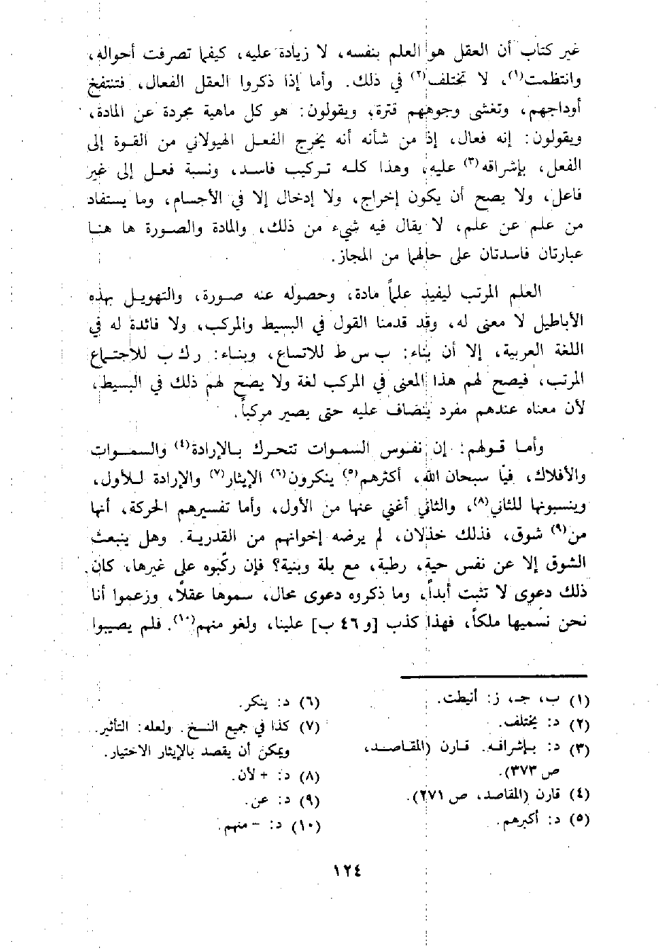 غير كتاب أن العقل هو العلم بنفسه، لا زيادة عليه، كيفما تصرفت أحواله، وانتظمت (¬1)، لا تختلف (¬2) في ذلك. وأما إذا ذكروا العقل الفعال، فتنتفخ أوداجهم، وتغشى وجوههم قترة، ويقولون: هو كل ماهية مجردة عن المادة، ويقولون: إنه فعال، إذ من شأنه أنه يخرج الفعل الهيولاني من القوة إلى الفعل، بإشراقه (¬3) عليه، وهذا كله تركيب فاسد، ونسبة فعل إلى غير فاعل، ولا يصح أن يكون إخراج، ولا إدخال إلا في الأجسام، وما يستفاد من علم عن علم، لا يقال فيه شيء من ذلك، والمادة والصورة ها هنا عبارتان فاسدتان على حالهما من المجاز.