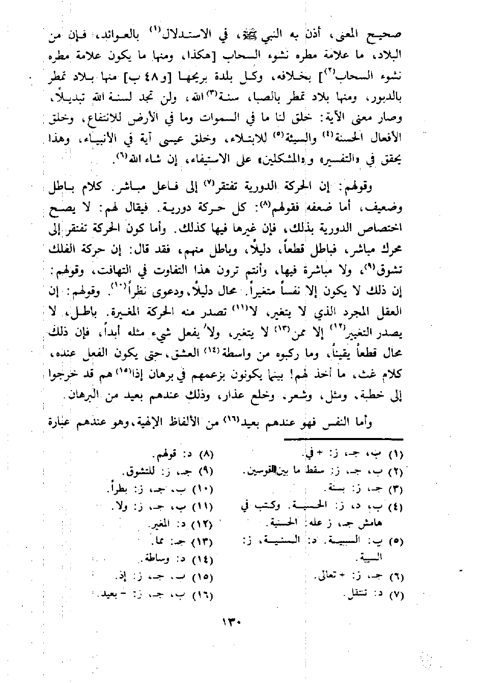 وقولهم: إن الحركة الدورية تفتقر (¬7) إلى فاعل مباشر. كلام باطل وضعيف، أما ضعفه فقولهم (¬8): كل حركة دورية. فيقال لهم: لا يصح اختصاص الدورية بذلك، فإن غيرها فيها كذلك. وأما كون الحركة تفتقر إلى محرك مباشر، فباطل قطعا، دليلا، وباطل منهم، فقد قال: إن حركة الفلك تشوق (¬9)، ولا مباشرة فيها، وأنتم ترون هذا التفاوت في التهافت، وقولهم: إن ذلك لا يكون إلا نفسا متغيرا. محال دليلا، ودعوى نظرا (¬10). وقولهم: إن العقل المجرد الذي لا يتغير، لا (¬11) تصدر منه الحركة المغيرة. باطل، لا يصدر التغيير (¬12) إلا ممن (¬13) لا يتغير، ولا يفعل شيء مثله أبدا، فإن ذلك محال قطعا يقينا، وما ركبوه من واسطة (¬14) العشق، حتى يكون الفعل عنده، كلام غث، ما أخذ لهم! بينما يكونون بزعمهم في برهان إذا (¬15) هم قد خرجوا إلا خطبة، ومثل، وشعر، وخلع عذار، وذلك عندهم بعيد من البرهان. وأما النفس فهو عندهم بعيد (¬16) من الألفاظ الإلهية، وهو عندهم عبارة