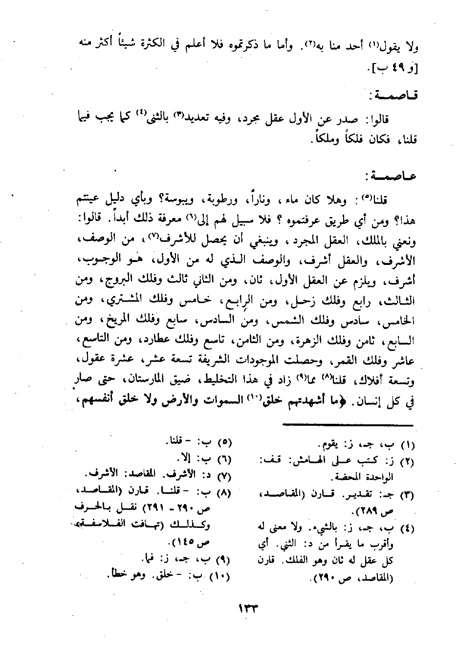 (¬8) ب: - قلنا. قارن (المقاصد، ص 290 - 291) نقل بالحرف وكذلك (تهافت الفلاسفة، ص 145).