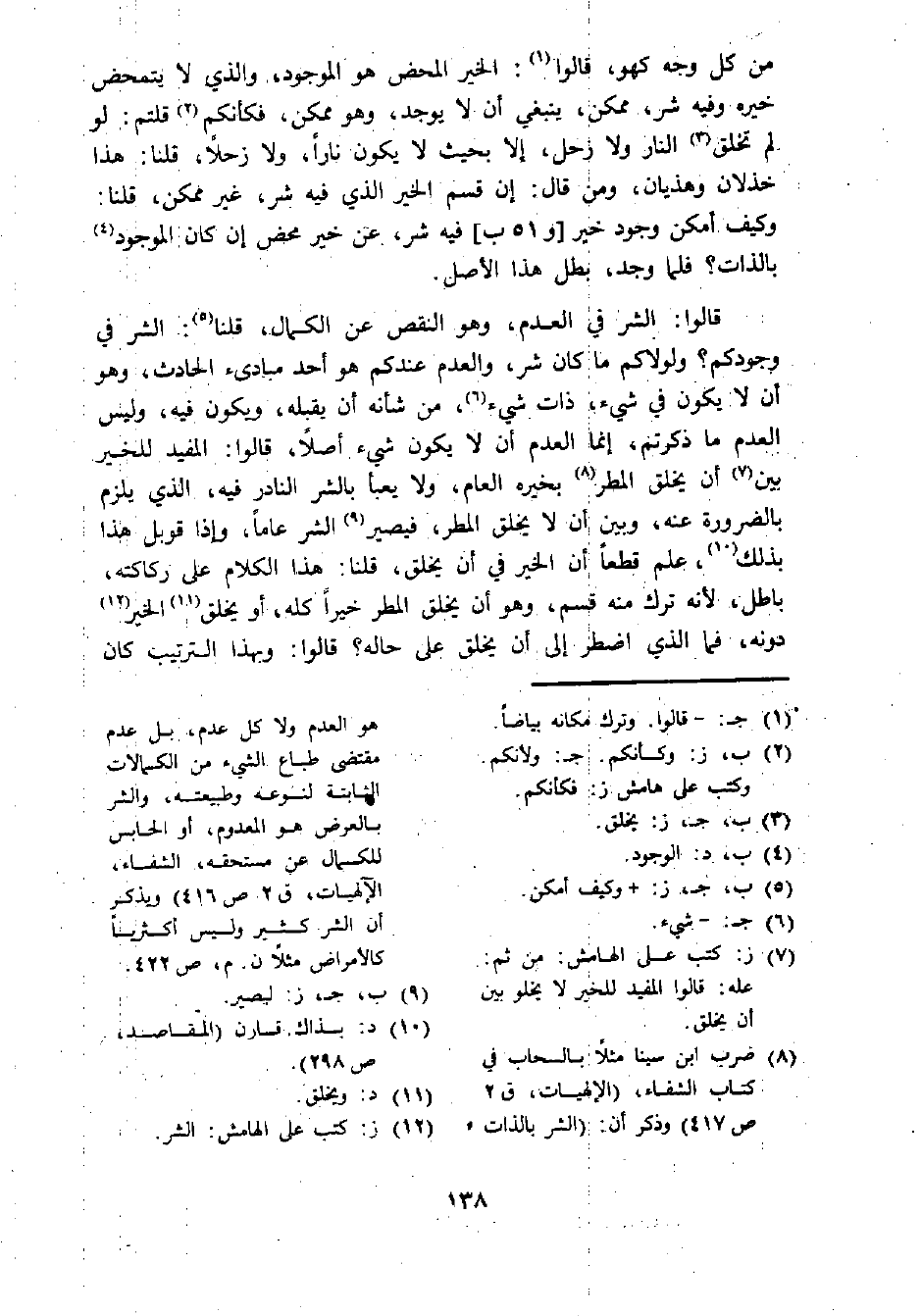 (¬8) ضرب ابن سينا مثلا بالسحاب في كتاب الشفاء، (الإلهيات، ق 2 ص 417) وذكر أن: (الشر بالذات هو العدم ولا كل عدم، بل عدم مقتضى طباع الشيء من الكمالات الثابتة لنوعه وطبيعته، والشر بالعرض هو المعدوم، أو الحابس للكمال عن مستحقه، الشفاء، الإلهيات، ق 2 ص 416) ويذكر أن الشر كثير وليس أكثريا كالأمراض مثلا ن. م، ص 422.