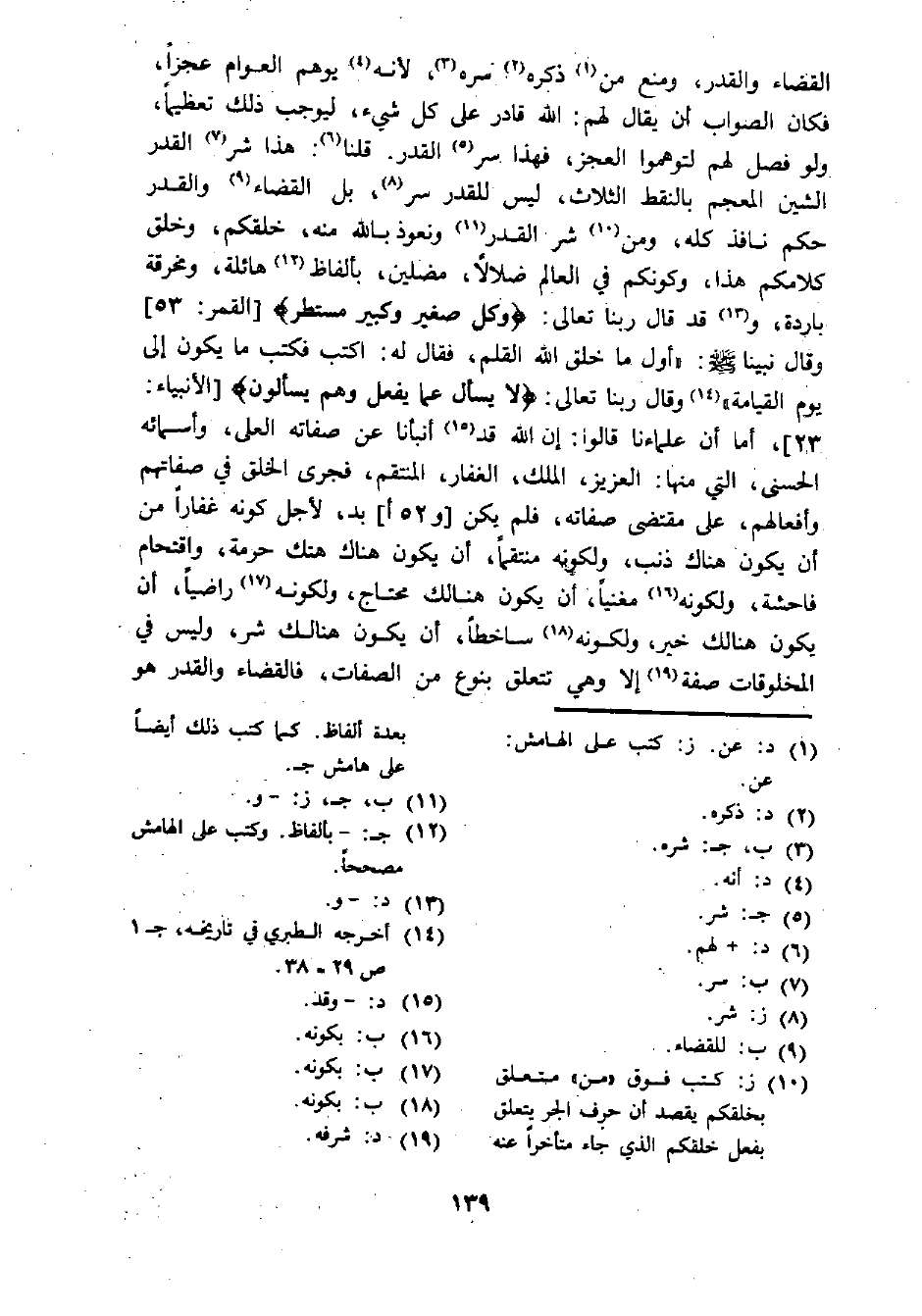 القضاء والقدر، ومنع من (¬1) ذكره (¬2) سره (¬3)، لأنه (¬4) يوهم العوام عجزا، فكان الصواب أن يقال لهم: الله قادر على كل شيء، ليوجب ذلك تعظيما، ولو فصل لهم لتوهموا العجز، فهذا سر (¬5) القدر. قلنا (¬6): هذا شر (¬7) القدر الشين المعجم بالنقط الثلاث، ليس للقدر سر (¬8)، بل القضاء (¬9) والقدر حكم نافذ كله، ومن (¬10) شر القدر (¬11) ونعوذ ب الله منه، خلقكم، وخلق كلامكم هذا، وكونكم في العالم ضلالا، مضلين، بألفاظ (¬12) هائلة، ومخرقة باردة، و (¬13) قد قال ربنا تعالى: {وكل صغير وكبير مستطر} [القمر: 53] وقال نبينا - صلى الله عليه وسلم -: "أول ما خلق الله القلم، فقال له: اكتب فكتب ما يكون إلى يوم القيامة" (¬14) وقال ربنا تعالى: {لا يسأل عما يفعل وهم يسألون} [الأنبياء: 23]، أما أن علماءنا قالوا: إن الله قد (¬15) أنبأنا عن صفاته العلى، وأسمائه الحسنى، التي منها: العزيز، الملك، الغفار، المنتقم، فجرى الخلق في صفاتهم وأفعالهم، على مقتضى صفاته، فلم يكن [و 52 أ]، بد، لأجل كونه غفارا من أن يكون هناك ذنب، ولكونه منتقما، أن يكون هناك هتك حرمة، واقتحام فاحشة، ولكونه (¬16) مغنيا، أن يكون هنالك محتاج، ولكونه (¬17) راضيا، أن يكون هنالك خير، ولكونه (¬18) ساخطا، أن يكون هنالك شر، وليس في المخلوقات صفة (¬19) إلا وهي تتعلق بنوع من الصفات، فالقضاء والقدر هو