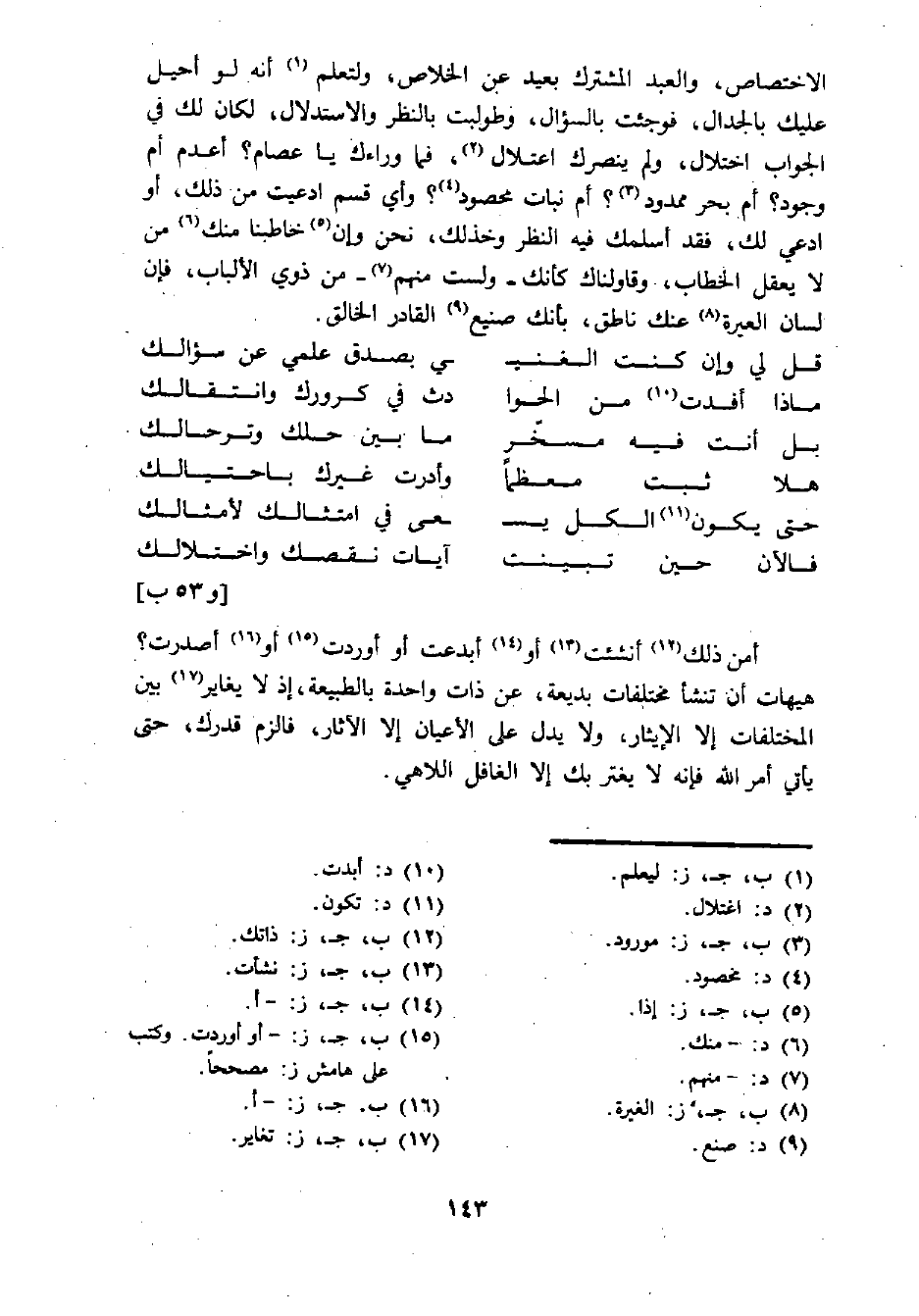 الاختصاص، والعبد المشترك بعيد عن الخلاص، ولتعلم (¬1) أنه لو أحيل عليك بالجدال، فوجئت بالسؤال، وطولبت بالنظر والاستدلال، لكان لك في الجواب اختلال، ولم ينصرك اعتلال (¬2)، فما وراءك يا عصام؟ أعدم أم وجود؟ أم بحر ممدود (¬3)؟ أم نبات محصود (¬4)؟ وأي قسم ادعيت من ذلك، أو ادعي لك، فقد أسلمك فيه النظر وخذلك، نحن وإن (¬5) خاطبنا منك (¬6) من لا يعقل الخطاب، وقاولناك كأنك - ولست منهم (¬7) - من ذوي الألباب، فإن لسان العيرة (¬8) عنك ناطق، بأنك صنيع (¬9) القادر الخالق.