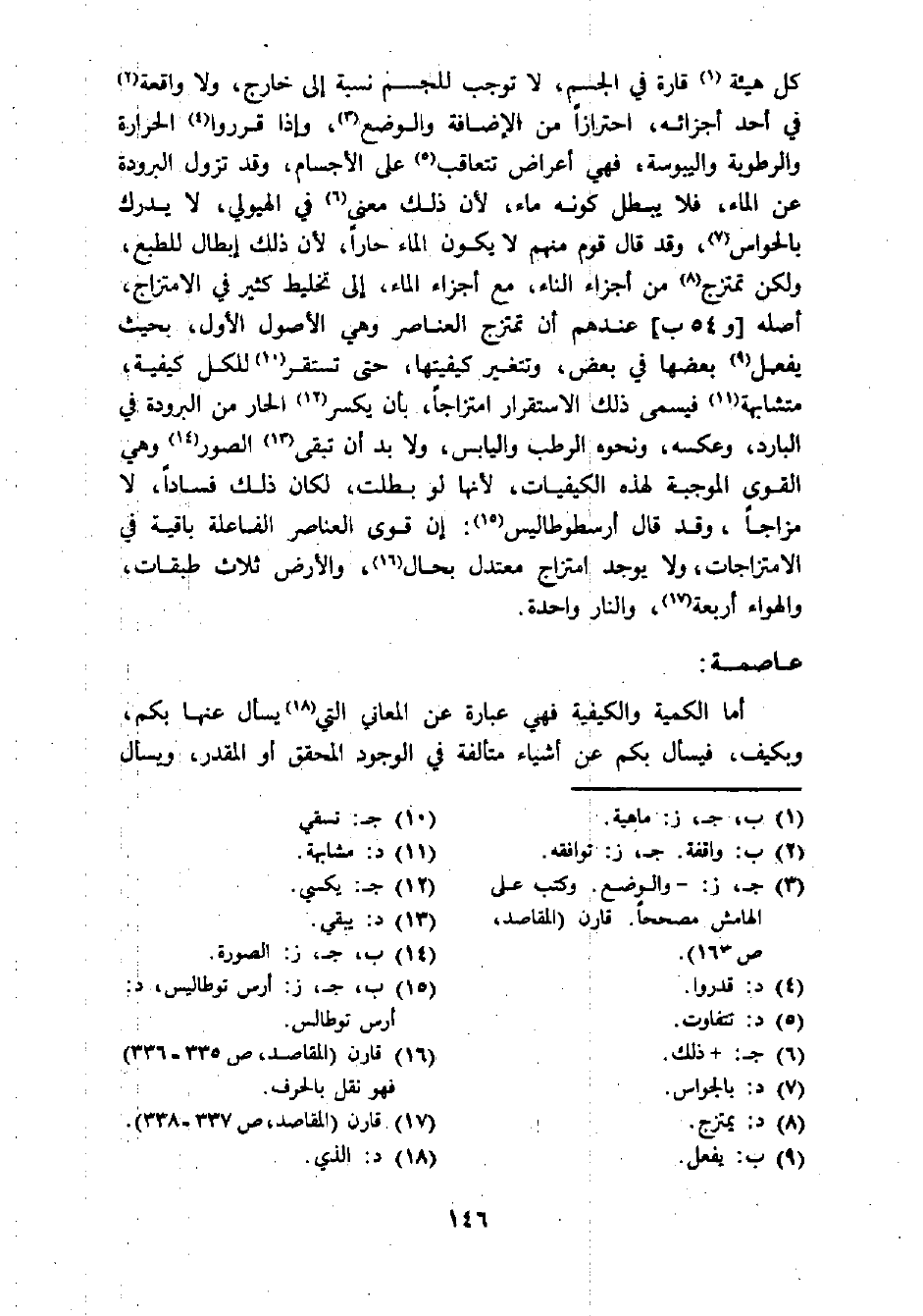 كل هيئة (¬1) قارة في الجسم، لا توجب للجسم نسبة إلى خارج، ولا واقعة (¬2) في أحد أجزائه، احترازا من الإضافة والوضع (¬3)، وإذا قرروا (¬4) الحرارة والرطوبة واليبوسة؟ فهي أعراض تتعاقب (¬5) على الأجسام، وقد تزول البرودة عن الماء، فلا يبطل كونه ماء، لأن ذلك معنى (¬6) في الهيولي، لا يدرك بالحواس (¬7)، وقد قال قوم منهم لا يكون الماء حارا، لأن ذلك إبطال للطبع، ولكن تمتزج (¬8) من أجزاء الناء، مع أجزاء الماء، إلى تخليط كثير في الامتزاج، أصله [و 54 ب]، عندهم أن تمتزج العناصر وهي الأصول الأول، بحيث يفعل (¬9) بعضها في بعض، وتتغير كيفيتها، حتى تستقر (¬10) للكل كيفية، متشابهة (¬11) فيسمى ذلك الاستقرار امتزاجا، بأن يكسر (¬12) الحار من البرودة في البارد، وعكسه، ونحوه الرطب واليابس، ولا بد أن تبقى (¬13) الصور (¬14) وهي القوى الموجبة لهذه الكيفيات، لأنها لو بطلت، لكان ذلك فسادا، لا مزاجا، وقد قال أرسطوطاليس (¬15): إن قوى العناصر الفاعلة باقية في الامتزاجات، ولا يوجد امتزاج معتدل بحال (¬16)، والأرض ثلاث طبقات، والهواء أربعة (¬17)، والنار واحدة.