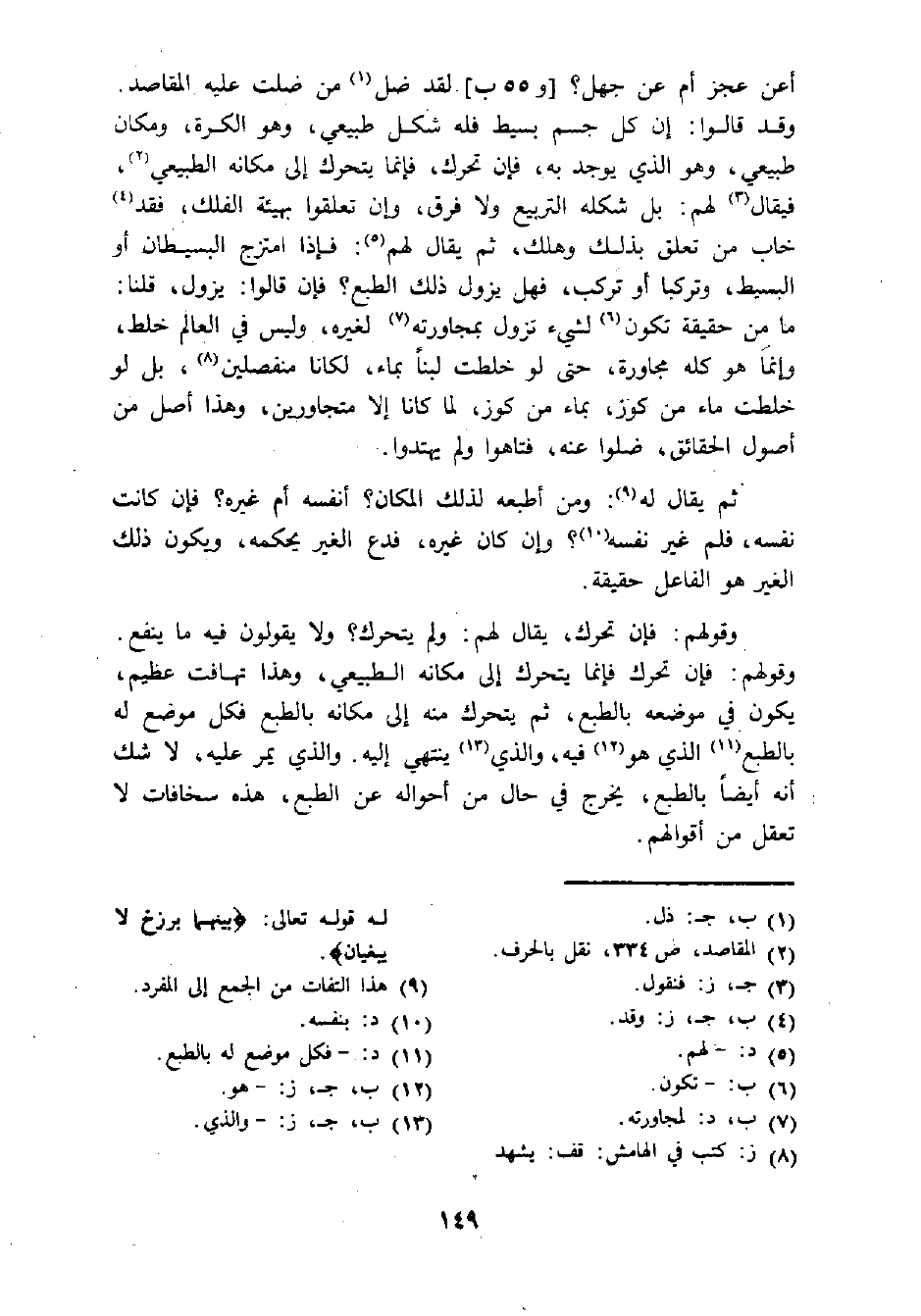 وقولهم: فإن تحرك، يقال لهم: ولم يتحرك؟ ولا يقولون فيه ما ينفع. وقولهم: فإن تحرك فإنما يتحرك إلى مكانه الطبيعي، وهذا تهافت عظيم، يكون في موضعه بالطبع، ثم يتحرك منه إلى مكانه بالطبع فكل موضع له بالطبع (¬11) الذي هو (¬12) فيه، والذي (¬13) ينتهي إليه. والذي يمر عليه، لا شك أنه أيضا بالطبع، يخرج في حال من أحواله عن الطبع، هذه سخافات لا تعقل من أقوالهم.