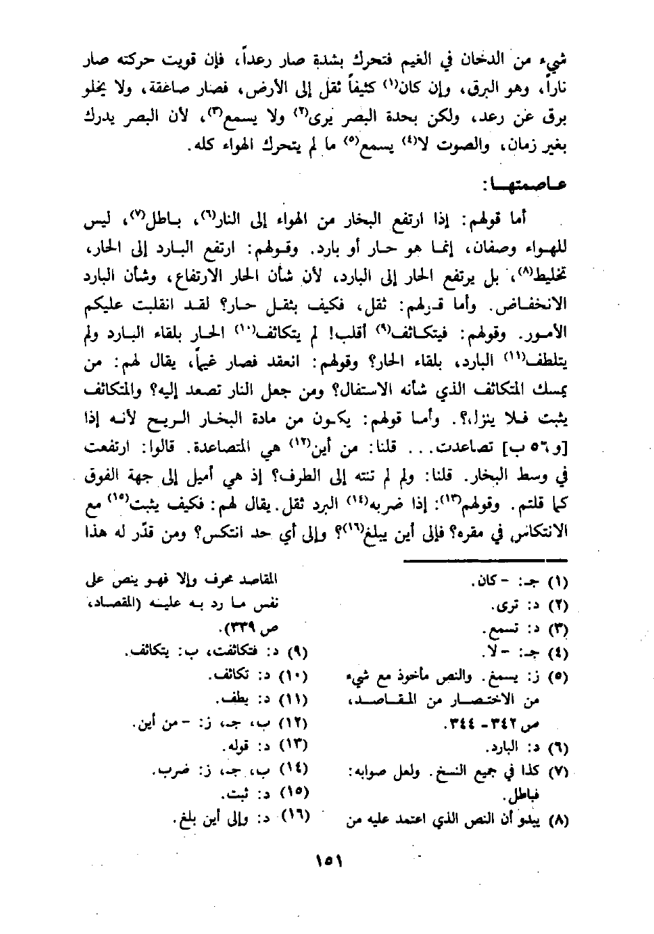أما قولهم: إذا ارتفع البخار من الهواء إلى النار (¬6)، باطل (¬7)، ليس للهواء وصفان، إنما هو حار أو بارد. وقولهم: ارتفع البارد إلى الحار، تخليط (¬8)، بل يرتفع الحار إلى البارد، لأن شأن الحار الارتفاع، وشأن البارد الانخفاض. وأما قولهم: ثقل، فكيف بثقل حار؟ لقد انقلبت عليكم الأمور. وقولهم: فيتكاثف (¬9) أقلب! لم يتكاثف (¬10) الحار بلقاء البارد ولم يتلطف (¬11) البارد، بلقاء الحار؟ وقولهم: انعقد فصار غيما، يقال لهم: من يمسك المتكاثف الذي شأنه الاستفال؟ ومن جعل النار تصعد إليه؟ والمتكاثف يثبت فلا ينزل؟. وأما قولهم: يكون من مادة البخار الريح لأنه إذا [و 56 ب]، تصاعدت ... قلنا: من أين (¬12) هي المتصاعدة. قالوا: ارتفعت في وسط البخار. قلنا: ولم لم تنته إلى الطرف؟ إذ هي أميل إلى جهة الفوق كما قلتم. وقولهم (¬13): إذا ضربه (¬14) البرد ثقل. يقال لهم: فكيف يثبت (¬15) مع الانتكاس في مقره؟ فإلى أين يبلغ (¬16)؟ وإلى أي حد انتكس؟ ومن قدر له هذا