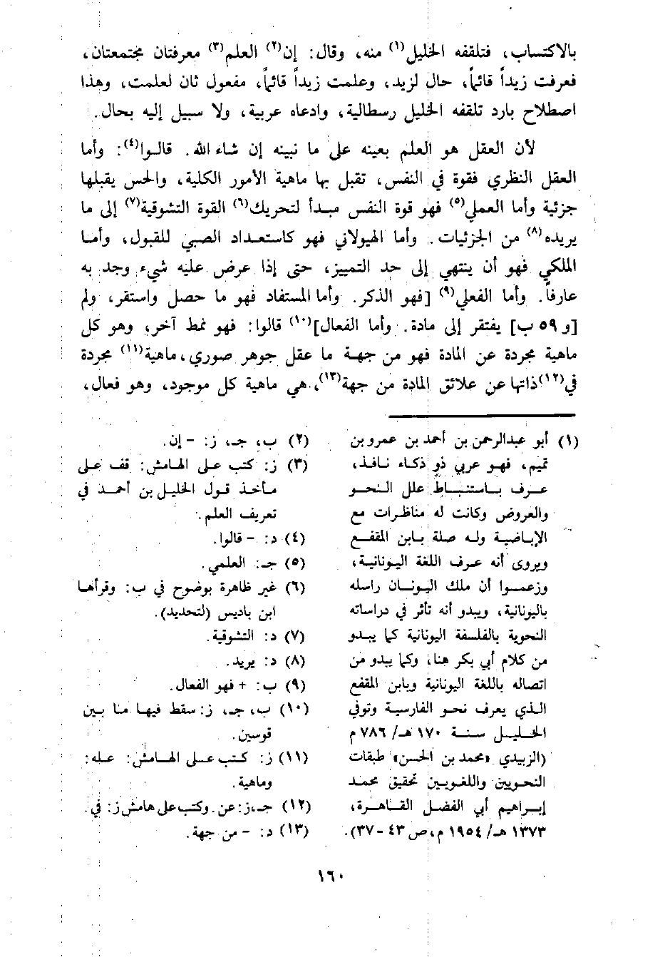 (¬1) أبو عبد الرحمن بن أحمد بن عمرو بن تميم، فهو عربي ذو ذكاء نافذ، عرف باستنباط علل النحو والعروض وكانت له مناظرات مع الإباضية وله صلة بابن المقفع ويروى أنه عرف اللغة اليونانية، وزعموا أن ملك اليونان راسله باليونانية، ويبدو أنه تأثر في دراساته النحوية بالفلسفة اليونانية كما يبدو من كلام أبي بكر هنا، وكما يبدو من اتصاله باللغة اليونانية وبابن المقفع الذي يعرف نحو الفارسية وتوفي الخليل سنة 170 هـ/ 786 م (الزبيدي "محمد بن الحسن" طبقات النحويين واللغويين تحقيق محمد إبراهيم أبي الفضل القاهرة، 1373 هـ/ 1954 م، ص 43 - 37).