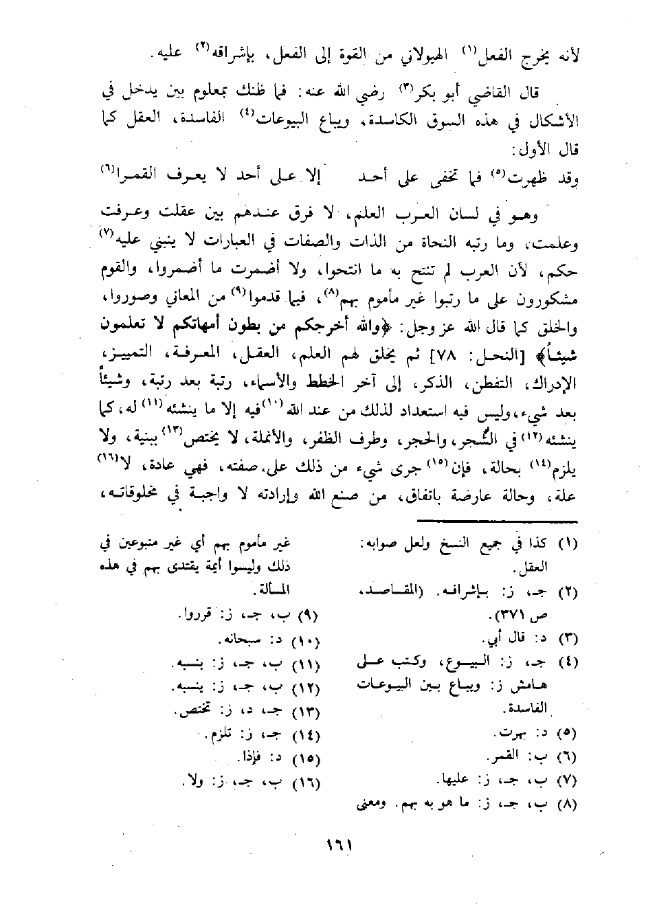 وهو في لسان العرب العلم، لا فرق عندهم بين عقلت وعرفت وعلمت، وما رتبه النحاة من الذات والصفات في العبارات لا ينبني عليه (¬7) حكم، لأن العرب لم تنتح به ما انتحوا، ولا أضمرت ما أضمروا، والقوم مشكورون على ما رتبوا غير مأموم بهم (¬8)، فيما قدموا (¬9) من المعاني وصوروا، والخلق كما قال الله عز وجل: {والله أخرجكم من بطون أمهاتكم لا تعلمون شيئا} [النحل: 78] ثم يخلق لهم العلم، العقل، المعرفة، التمييز، الإدراك، التفطن، الذكر، إلى آخر الخطط والأسماء، رتبة بعد رتبة، وشيئا بعد شيء، وليس فيه استعداد لذلك من عند الله (¬10) فيه إلا ما ينشئه (¬11) له، كما ينشئه (¬12) في الشجر، والحجر، وطرف الظفر، والأنملة، لا يختص (¬13) ببنية، ولا يلزم (¬14) بحالة، فإن (¬15) جرى شيء من ذلك على صفته، ففي عادة، لا (¬16) علة، وحالة عارضة باتفاق، من صنع الله وإرادته لا واجبة في مخلوقاته،
